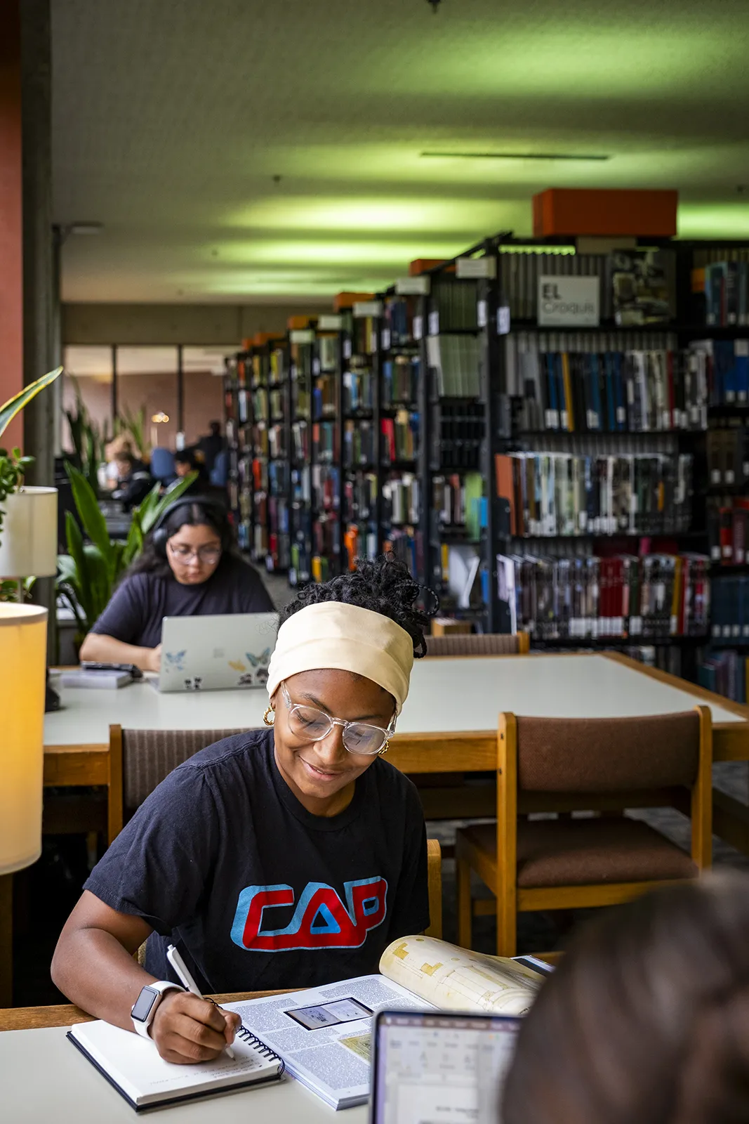 A student is seated in the College of Architecture and Planning library during a photo shoot featuring satellite libraries for the University Libraries department.