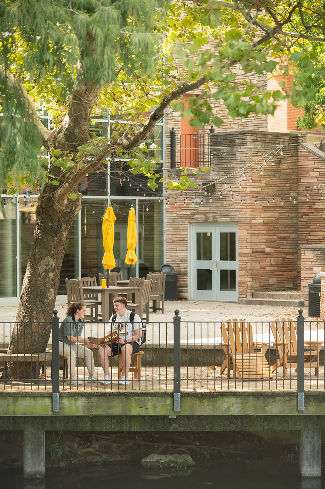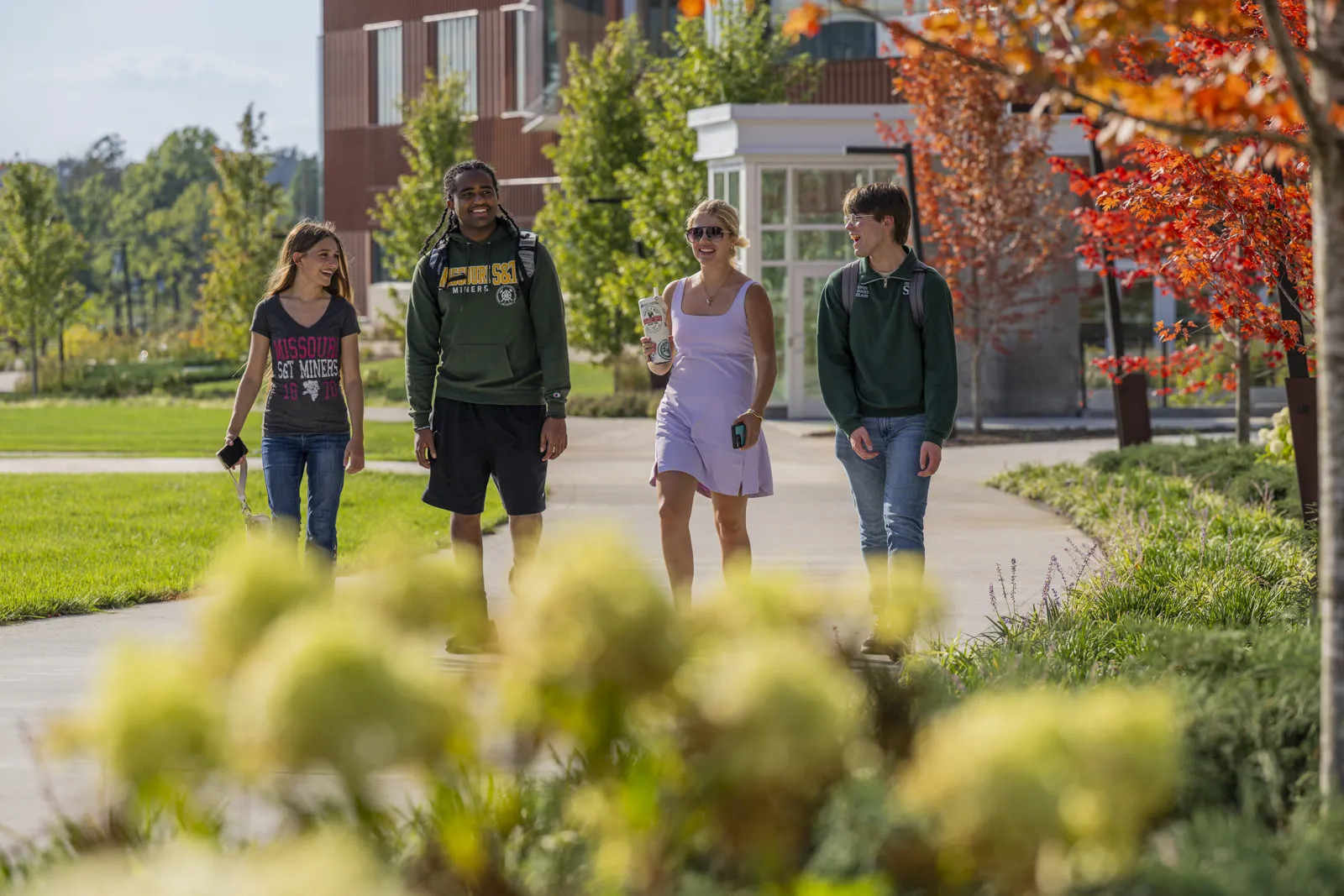 Students take part in a fall marketing photo shoot. Remove tool used to clean up sidewalk and remove cell tower from sky.