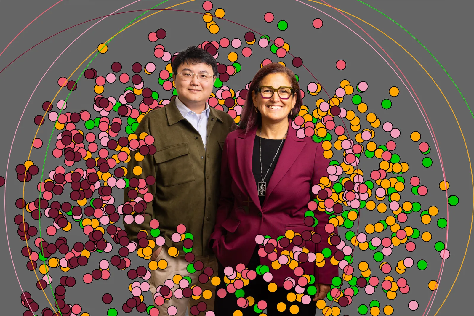 Illustrative portrait of research faculty Patricia Diaz-Moreno and Lu Li combining a data plot from their dental research as the background for this image.