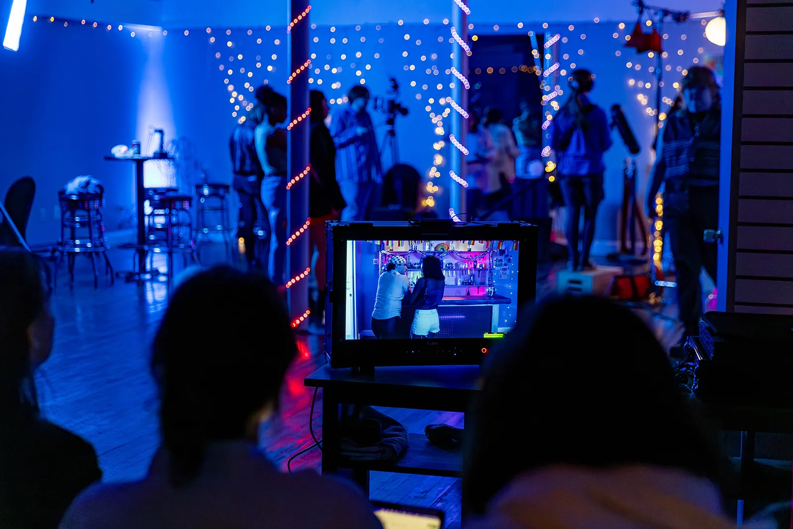 On the set of the student film, "Chemistry," the director and producers watch on the monitor as the scene plays out in front on and behind the camera.