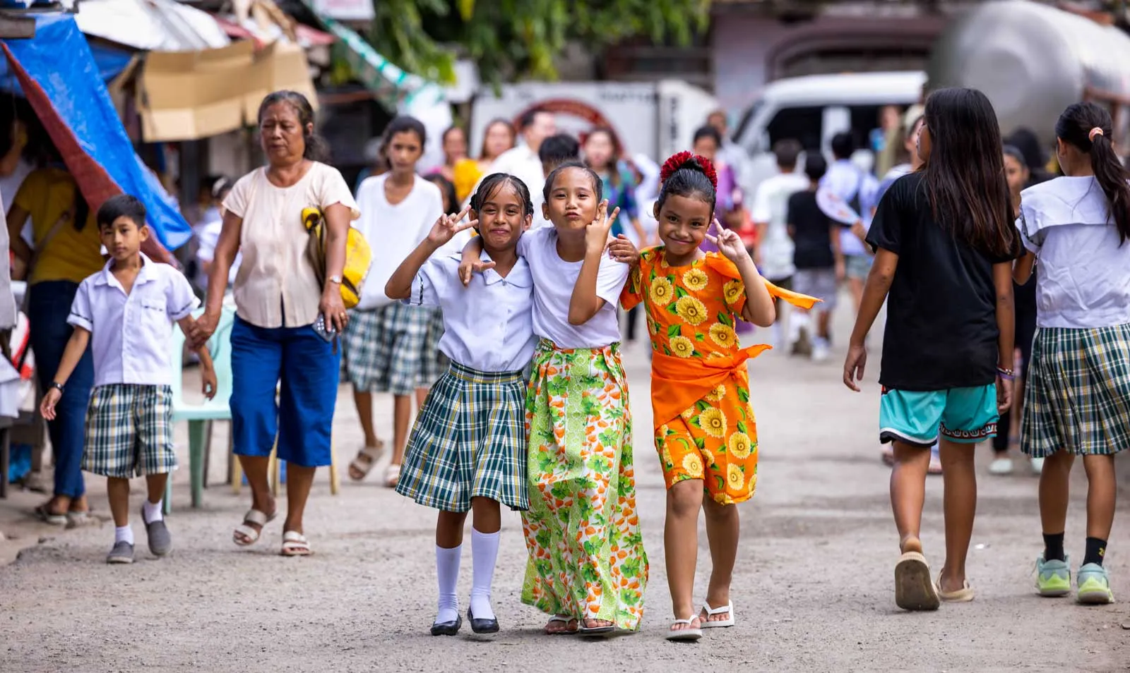 Three young students from Punto Engaño Elementary in Mactan, Philippines walk home after school. Two of the girls performed for a visiting delegation from the university. The university is partnering with the elementary school to provide new books and study materials for the students. The university president was visiting the school as part of a trip for donors to see where the president spent her childhood.