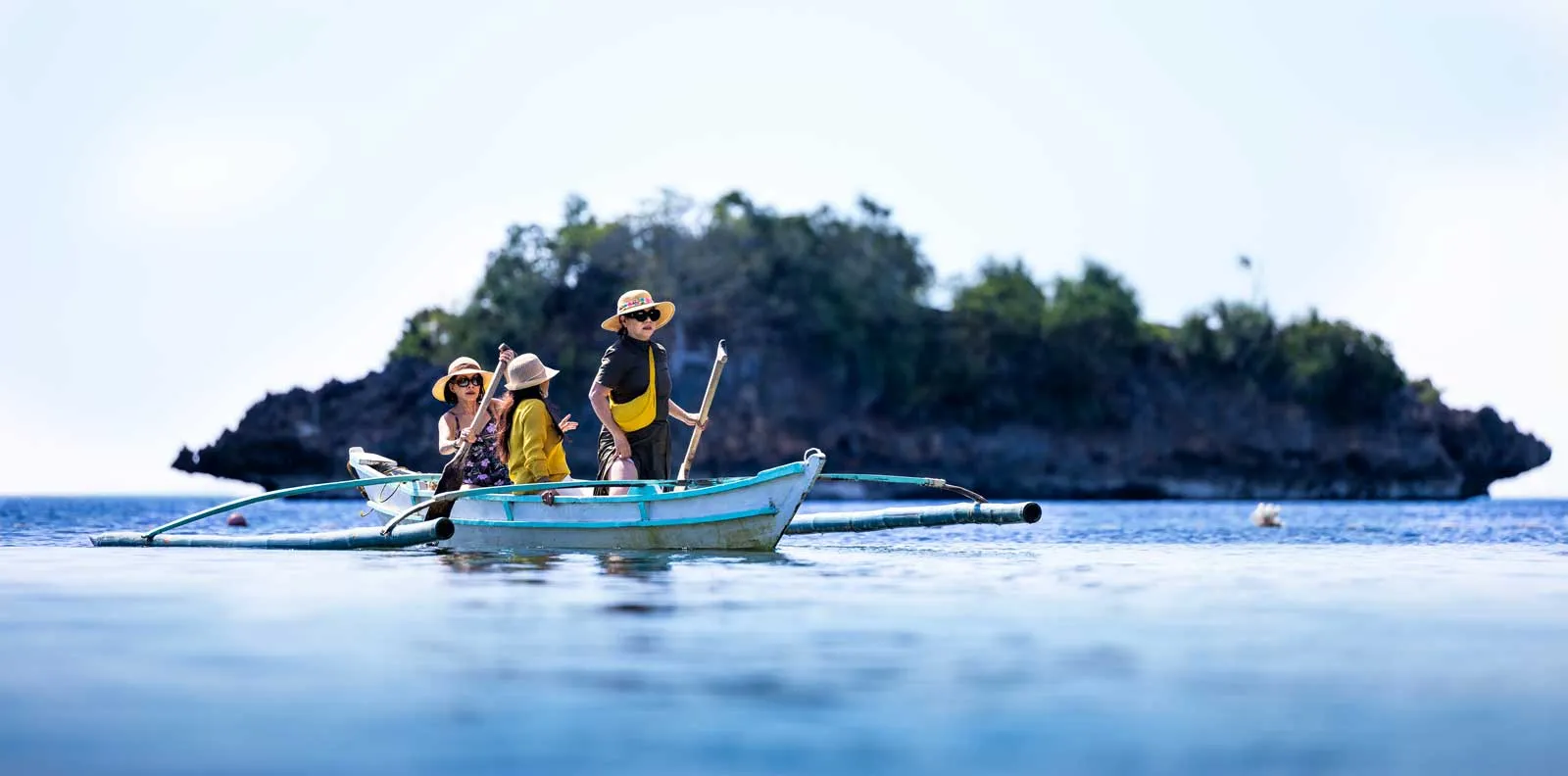 University President Astrid S. Tuminez paddles a canoe as she spends time with her sisters on the waters near their mother's childhood home in Narai Cove, Philippines. The trip was part of a multicultural experience for some of the major donors to the university.