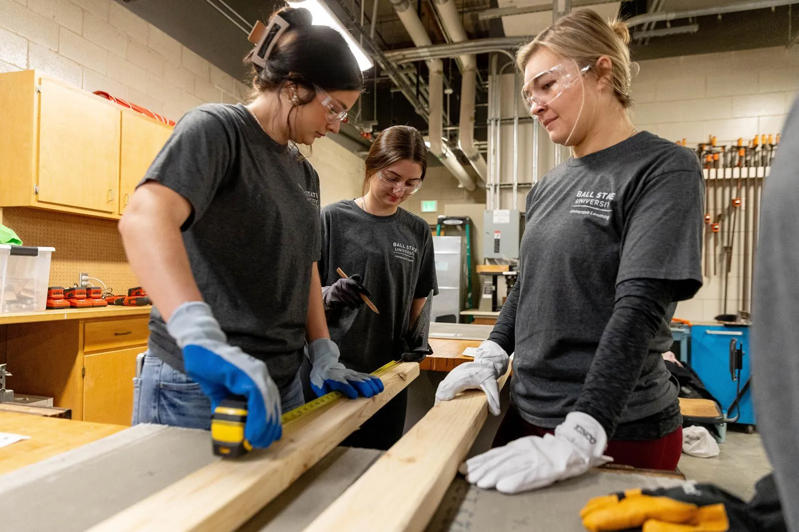 Three interior design students measure wood to be cut in a demonstration on installing floor tile backing.