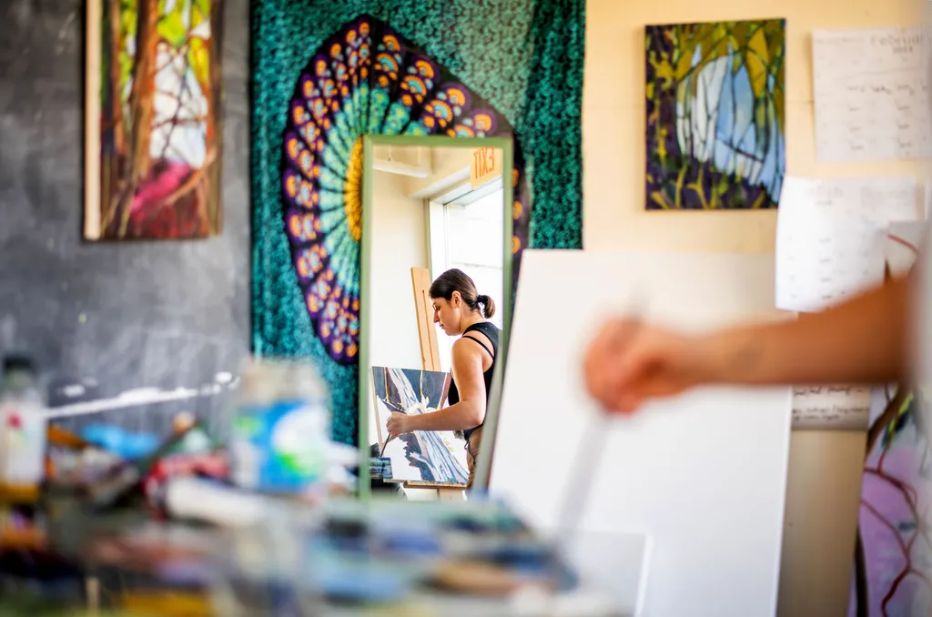 Molly Tank paints in a Calder Art Center studio space as she works on oil paintings for her senior show coming up in March. "Nature is my big inspiration, being from Up North." she said. Tank, of Traverse City, is a BFA major with a minor in environmental sustainability studies.
