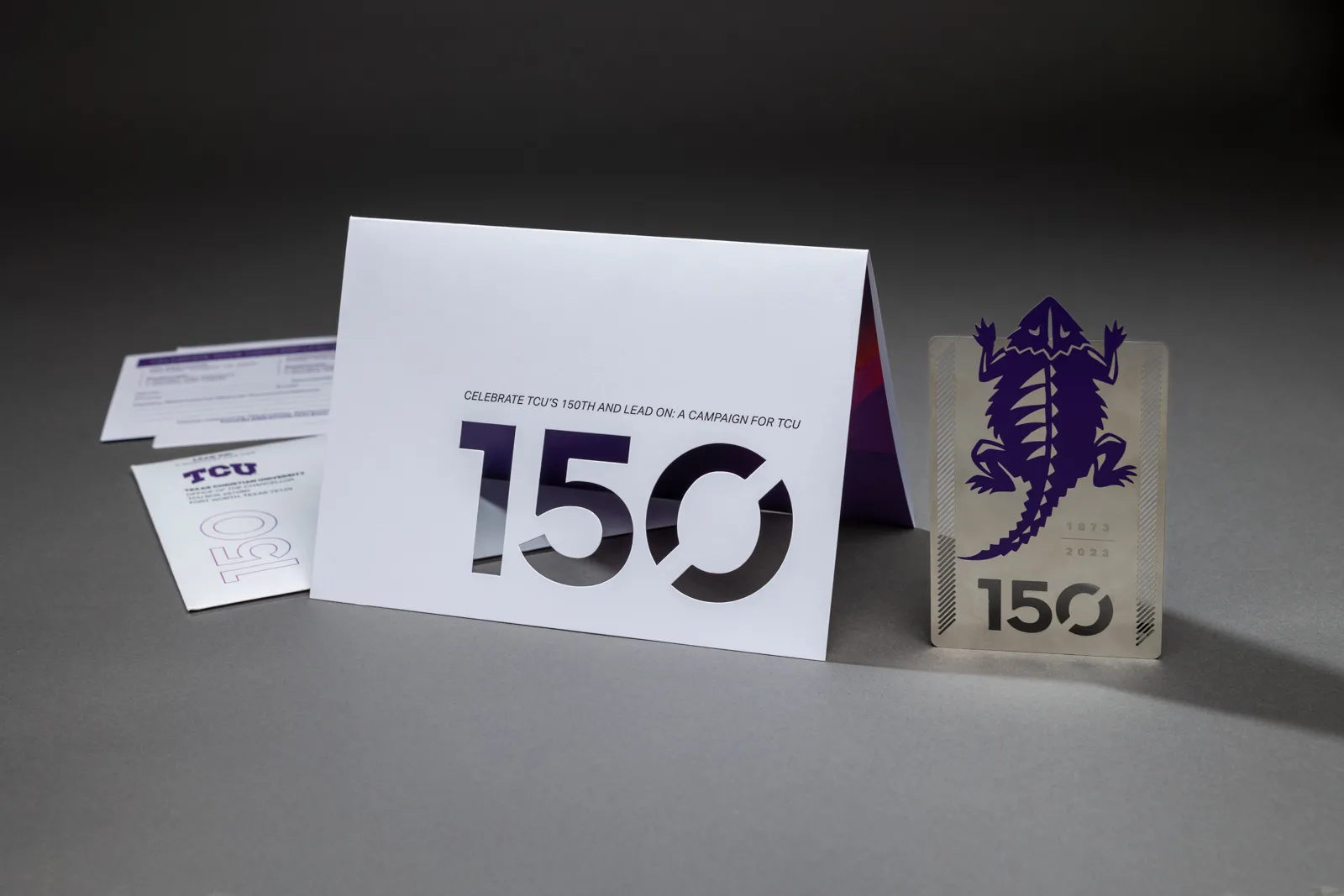 Product photography of TCU's invitation mailler to the 150th celebration.