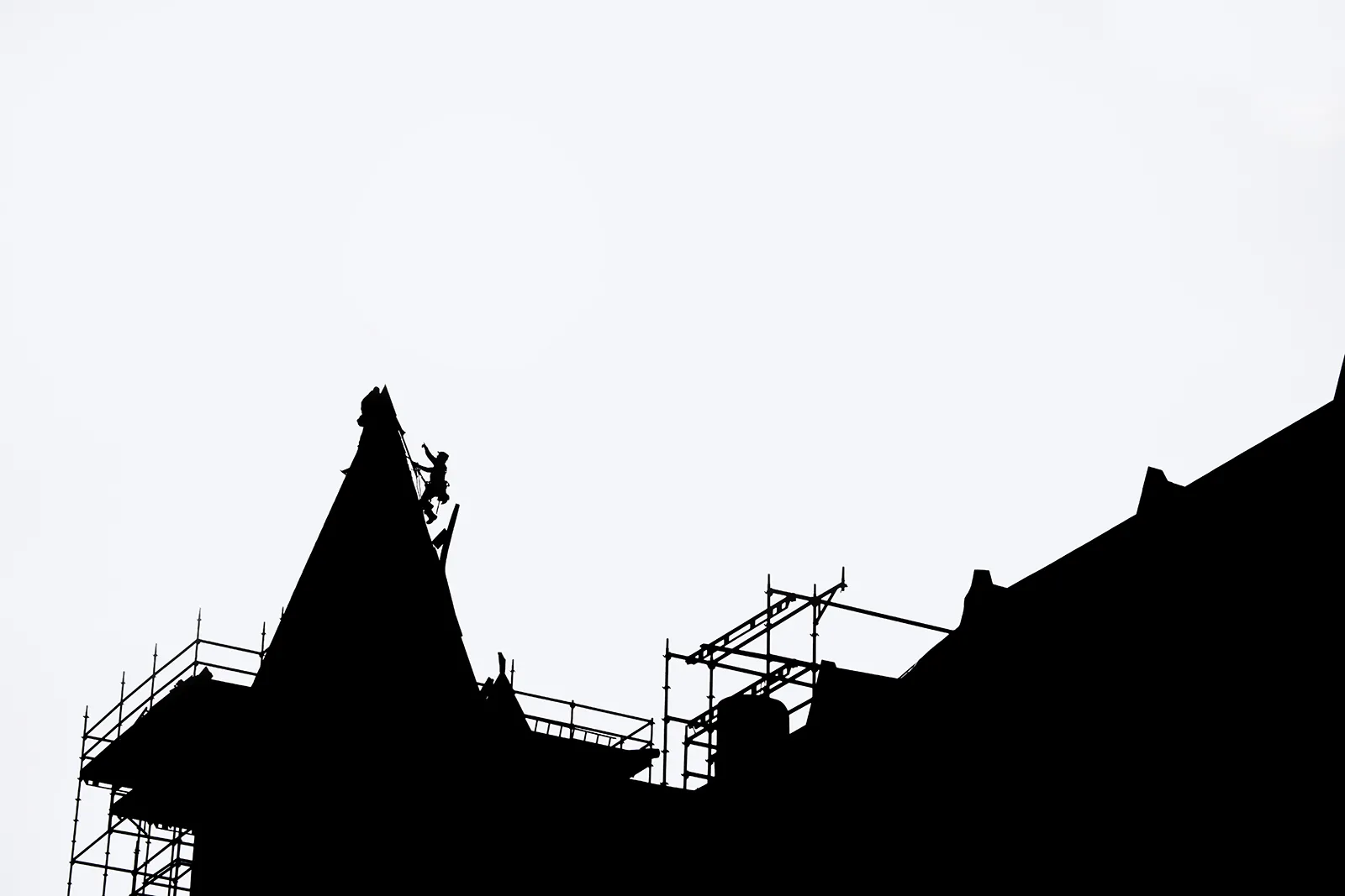 Roofers replace the tiles on DuBourg Hall on an overcast day on February 6, 2024.