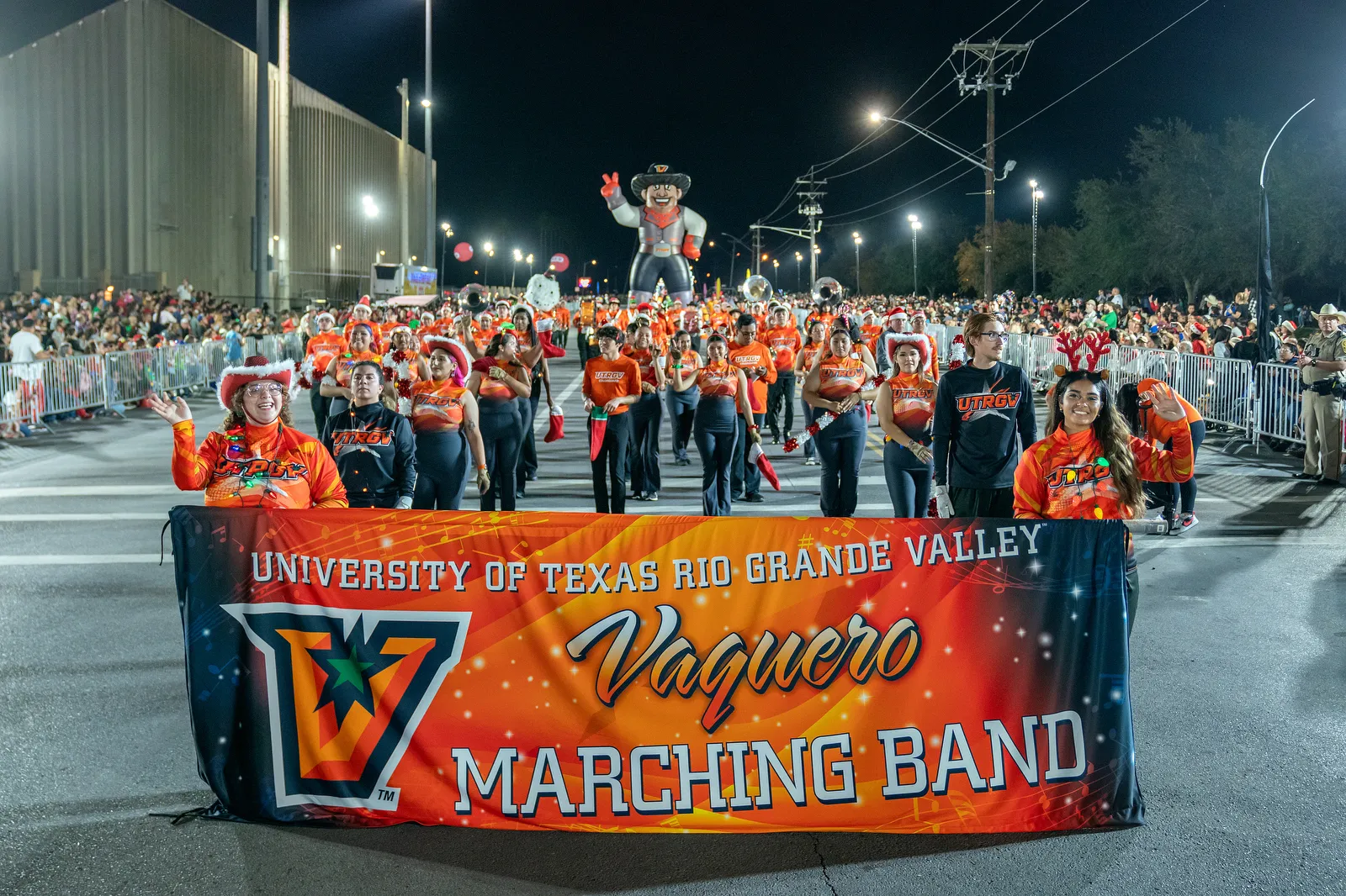 The university's first marching band takes part in the city of McAllen's Holiday Parade on Saturday, Dec. 2, 2023.