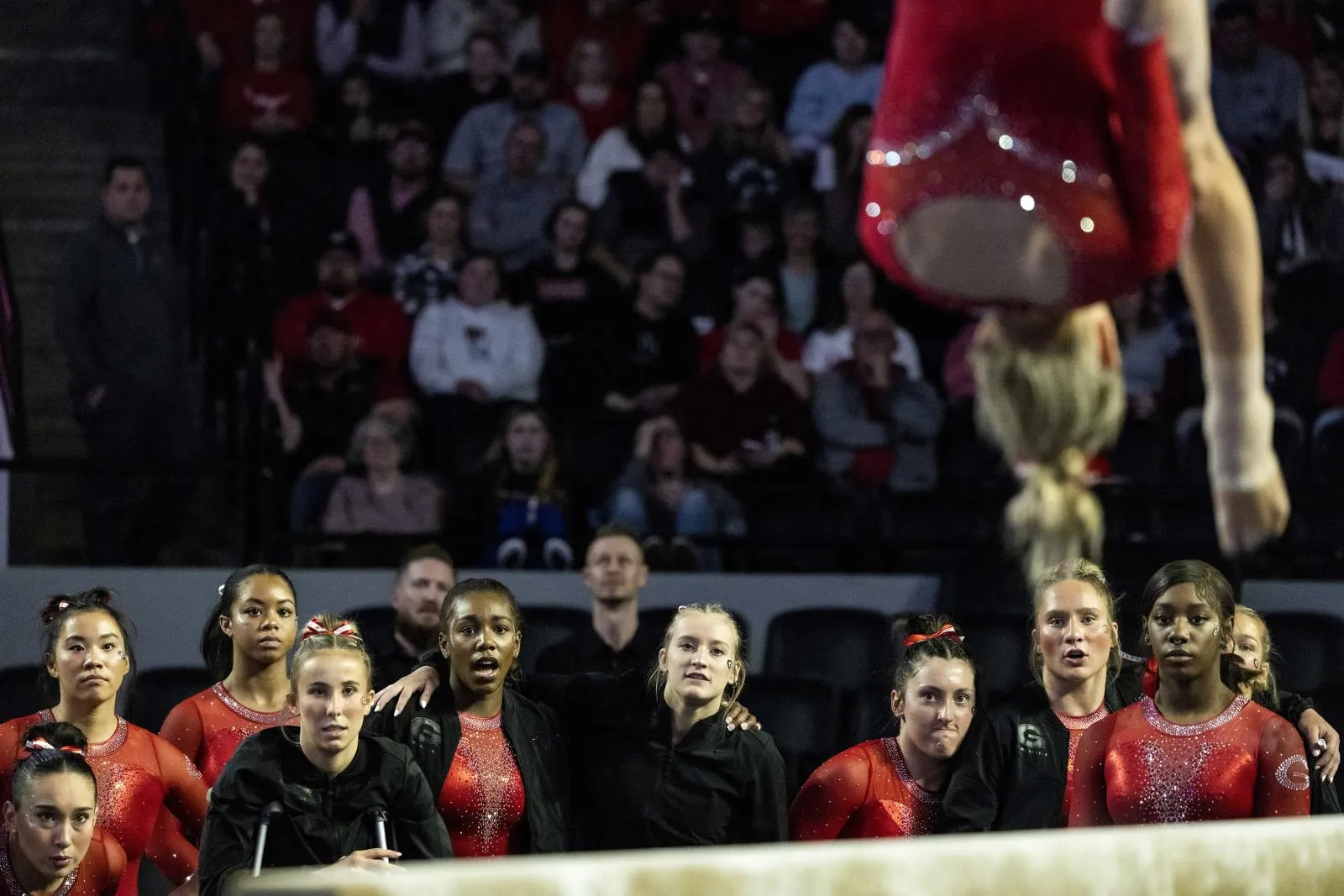 Members of the gymnastics team hold their collective breath as a teammate performs her beam routine during the first home meet of the season.