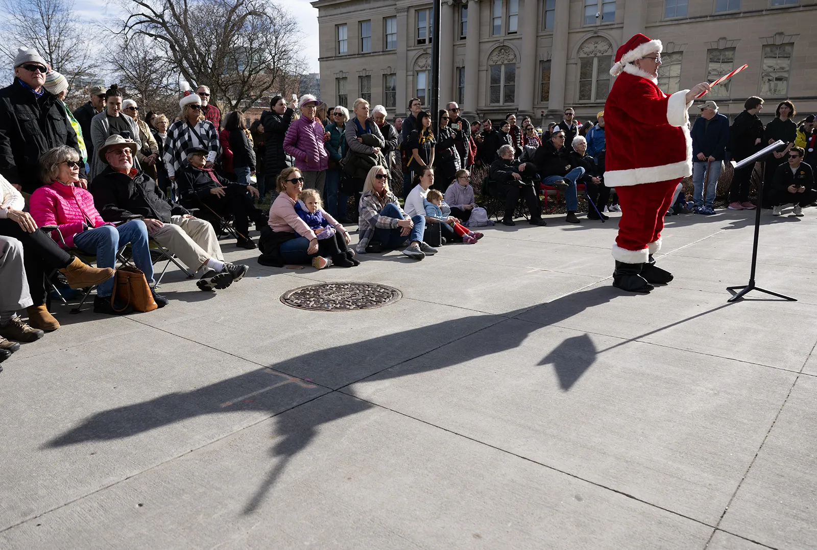 Conducting with a candy cane, John Manning, keeps the tubas together during the annual Holiday Tuba concert held on the Friday before Finals Week.