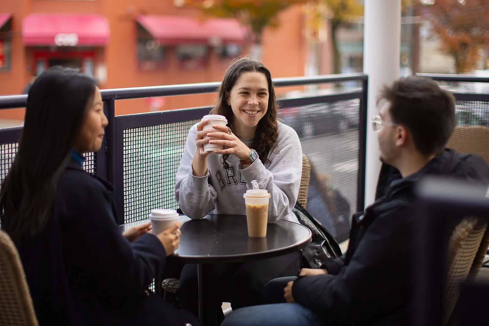 Student Aliza Kopans enjoys a coffee with some friends during a marketing shoot.