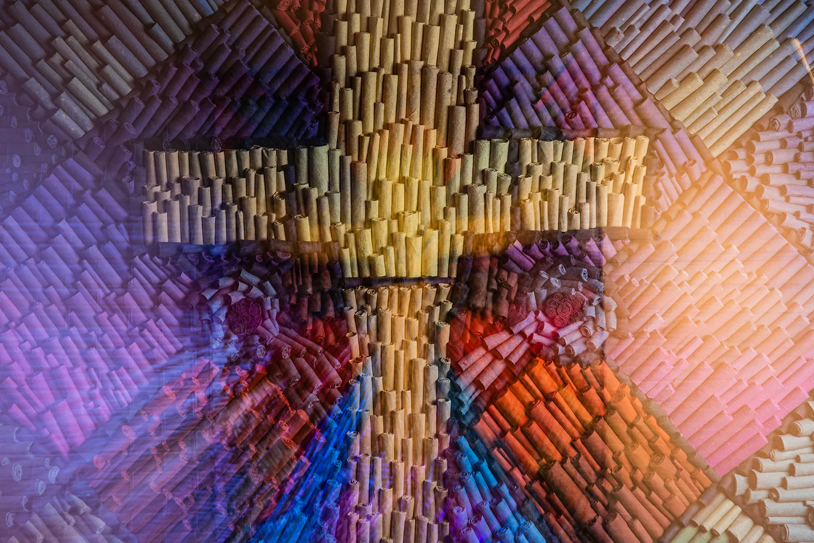 An artificially-lit slow shutter, zoomed photograph of artwork entitled "Embodied, Cross and Anchors" that was recently dedicated to the Holy Cross Institute. The piece is made out of rolled paper that was created from clothing worn during service and ministry from retired Brothers of Congregation of Holy Cross and members of the Holy Cross Institute. Notes and messages calling for hope, peace and faith have been written on the paper and rolled into tight spirals. The spirals are symbols of people past, present and future that hold the value of Holy Cross to their core. As the symbol of Holy Cross, the cross with anchors stands as a continual reminder of the work to bring hope into the world.