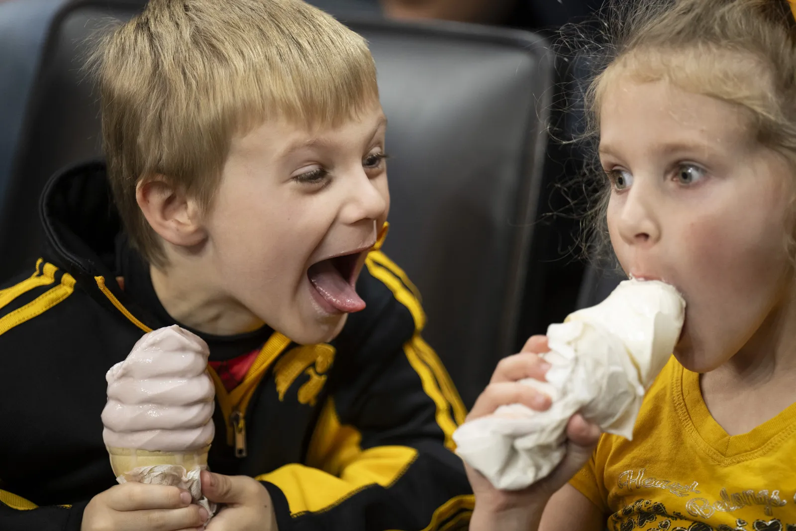 Two kids clown around while enjoying the Carver Cones at Carver-Hawkeye Arena.