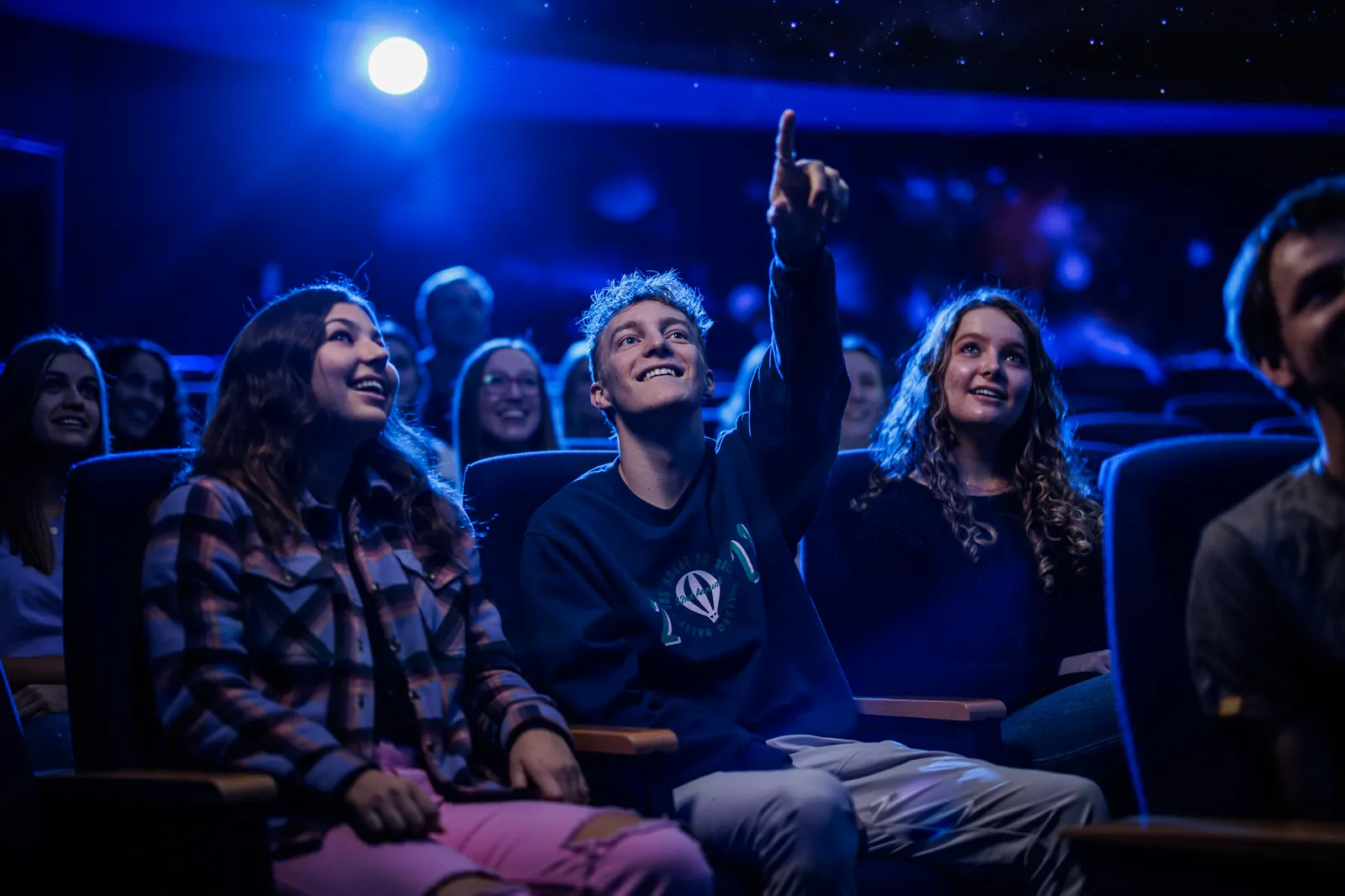 Promo shoot for the planetarium, showing students in their seats pointing at the stars.