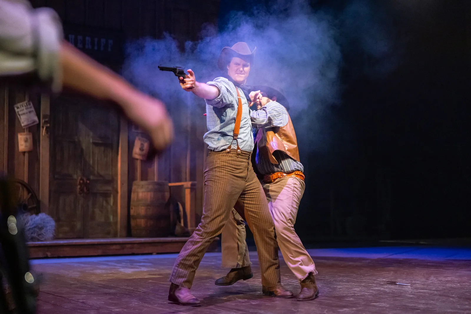 Romeo guns down Mercutio in the university's Western-themed adaptation of Romeo and Juliet.