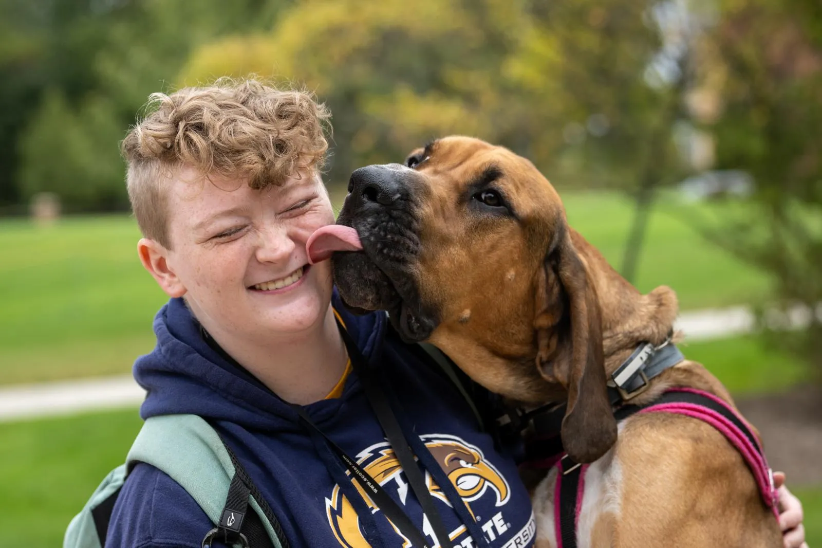 "Duke" gives his owner a big sloppy kiss. Duke is a part blood hound, part great dane and is trained to sniff out cardiac issues.