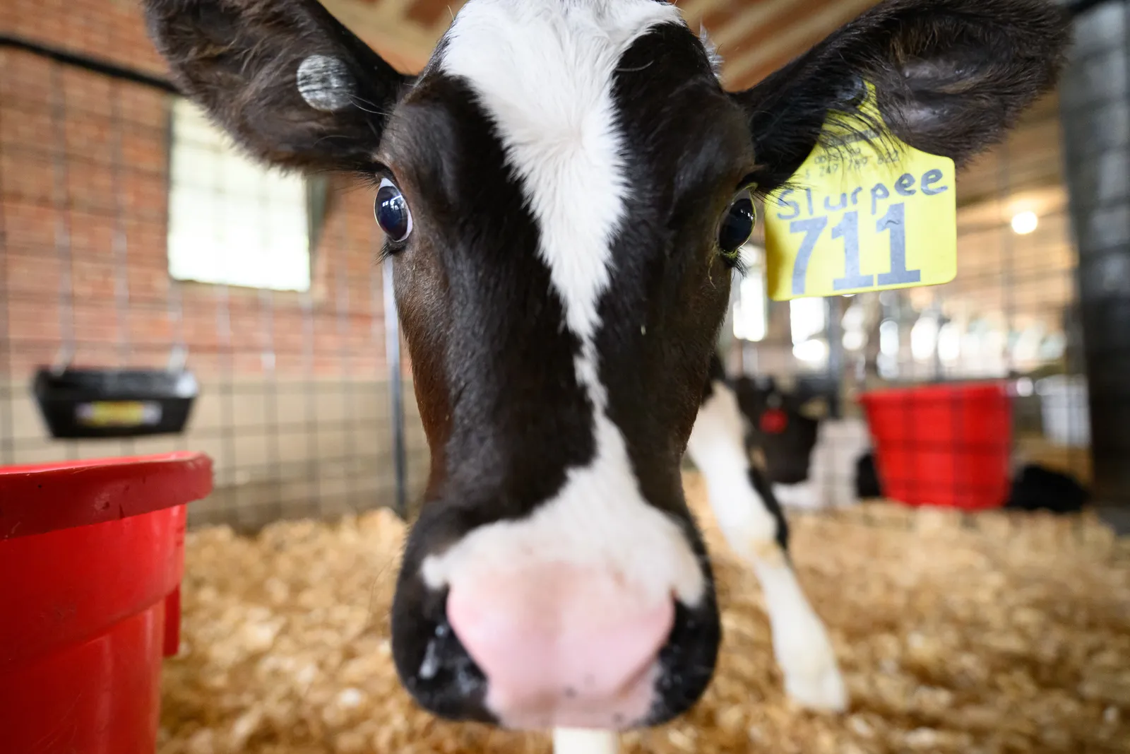 Two week old teaching animal unit calf #711, named Slurpee, tries to figure out if the camera is edible.