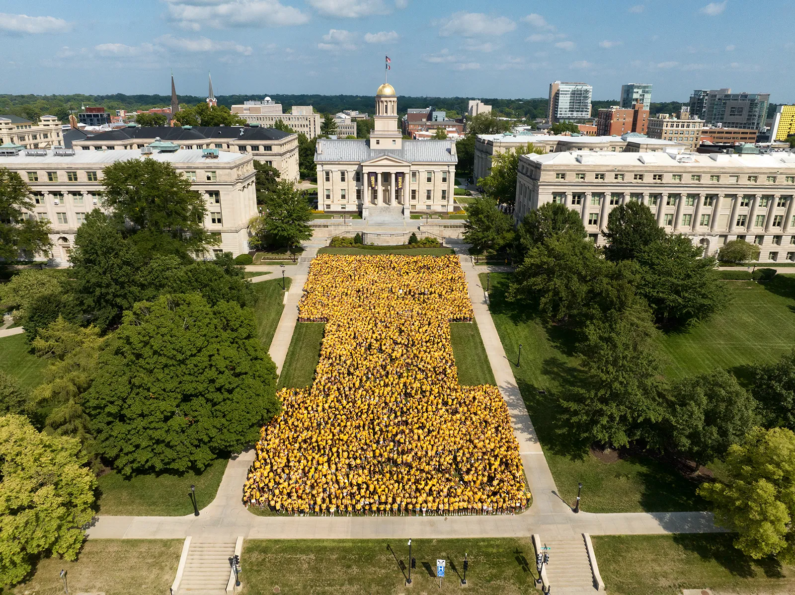 Class of 2027 lines up in a Block I formation for a group photo on the Pentacrest