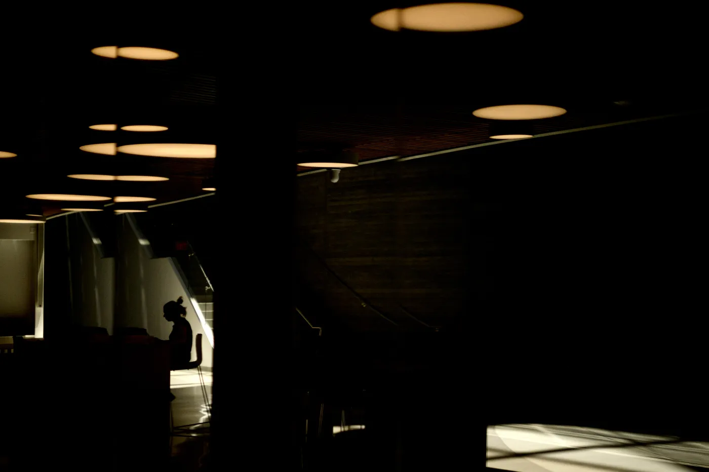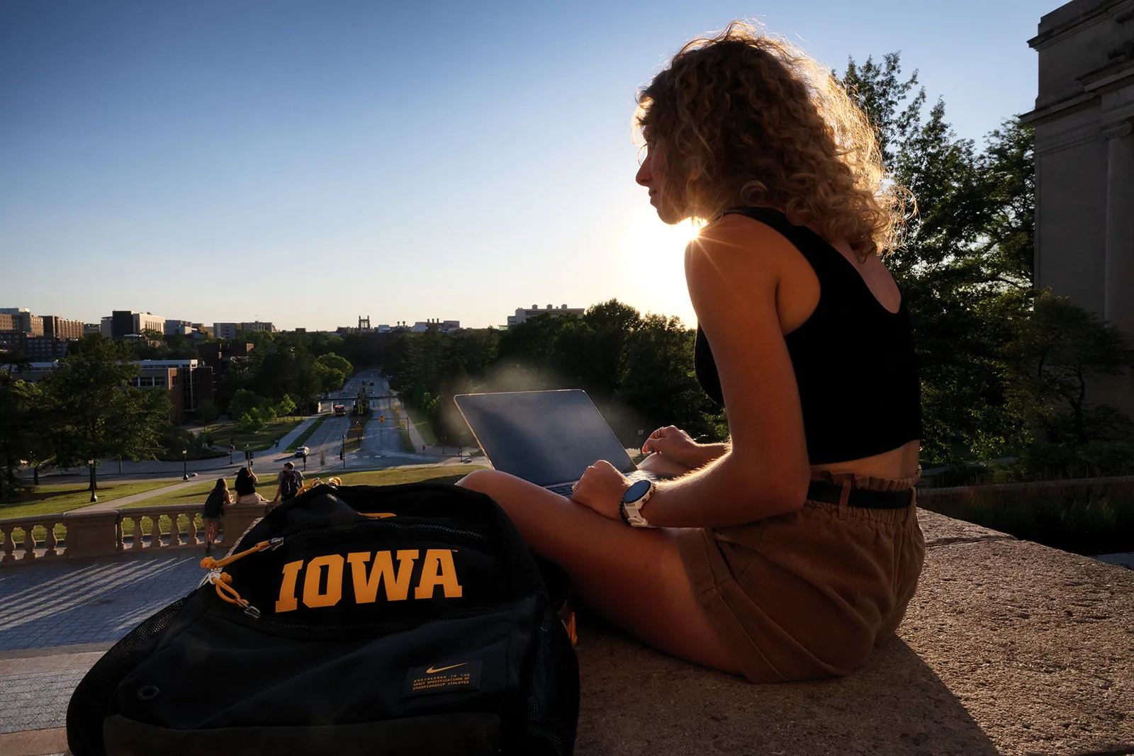 A student admires the sunset view from the west portico of the Old Capitol while studying