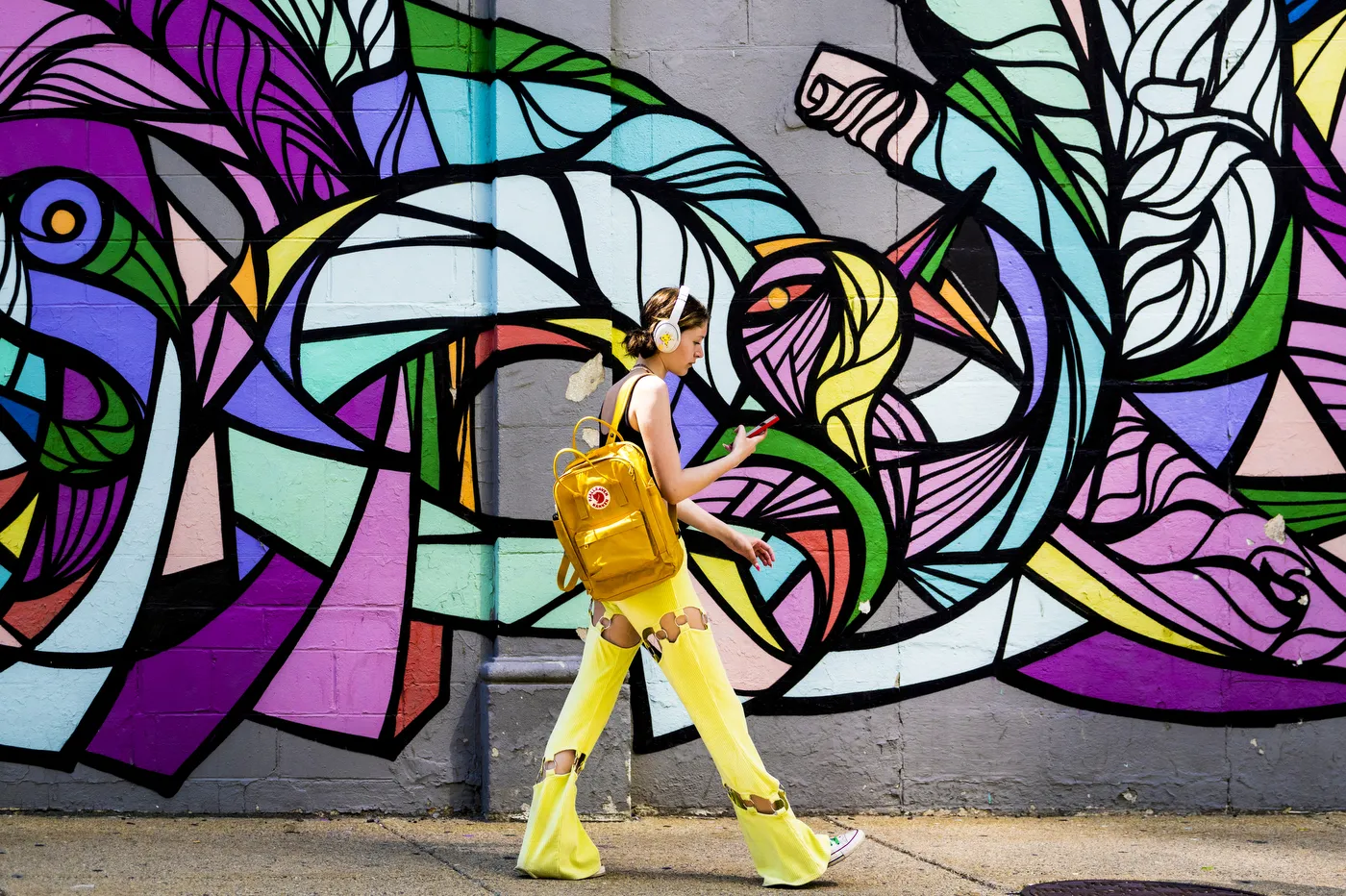 Sophia Preiser walks by Daniel Anguilu and Cedric Douglas ' collaborative mural on the side of the now former Punter's Pub on Huntington Avenue.