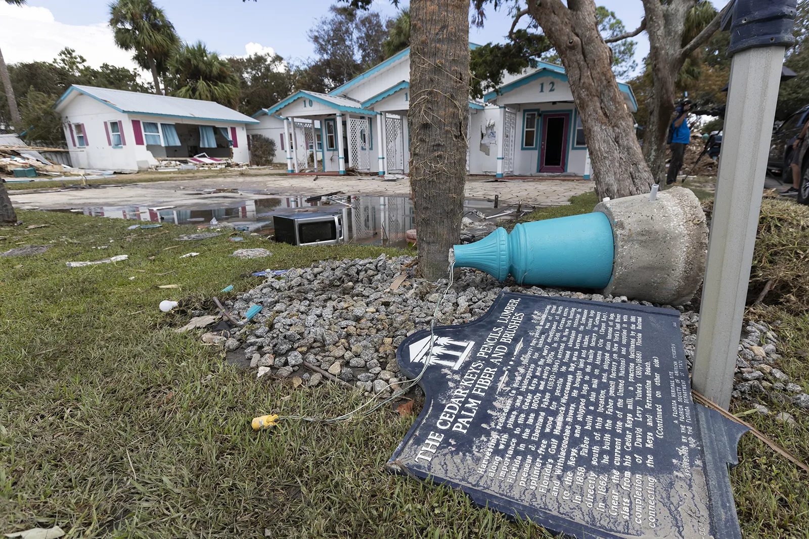 A toppled historical marker is strewn on the muddy lawn of a destroyed seaside motel in Cedar Key, Florida where 12 to 15 foot storm surge gutted buildings, ripped structures from their foundations, and flooded streets when Hurricane Idalia swept through on Wednesday, August 30th, 2023. Cedar Key is a tiny fishing village on Florida's Gulf coast and is home to the University of Florida's Nature Coast Biological Station, which also suffered extensive damage due to the hurricane.