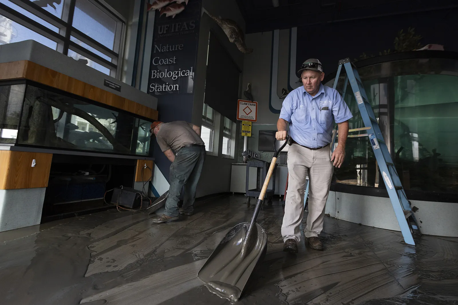 Danny Christmas (blue shirt) and Trent Suggs (background), both of the UF/IFAS Emergency Response Team, shovel mud from the floor of the lobby of UF/IFAS's Nature Coast Biological Station in Cedar Key, Florida on the morning following Hurricane Idalia's landfall. The storm produced a record 12-15 foot storm surge that flooded all of the lab's ground floor and did extensive damage to the entire facility.