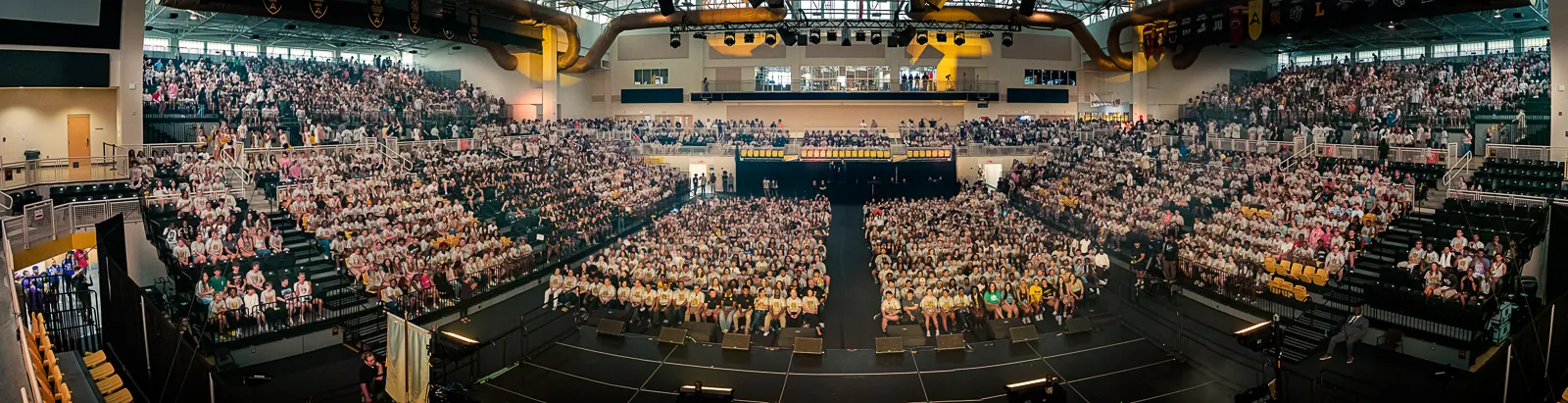 The 2023 freshman class participate in First Year Convocation and have a group photo made.