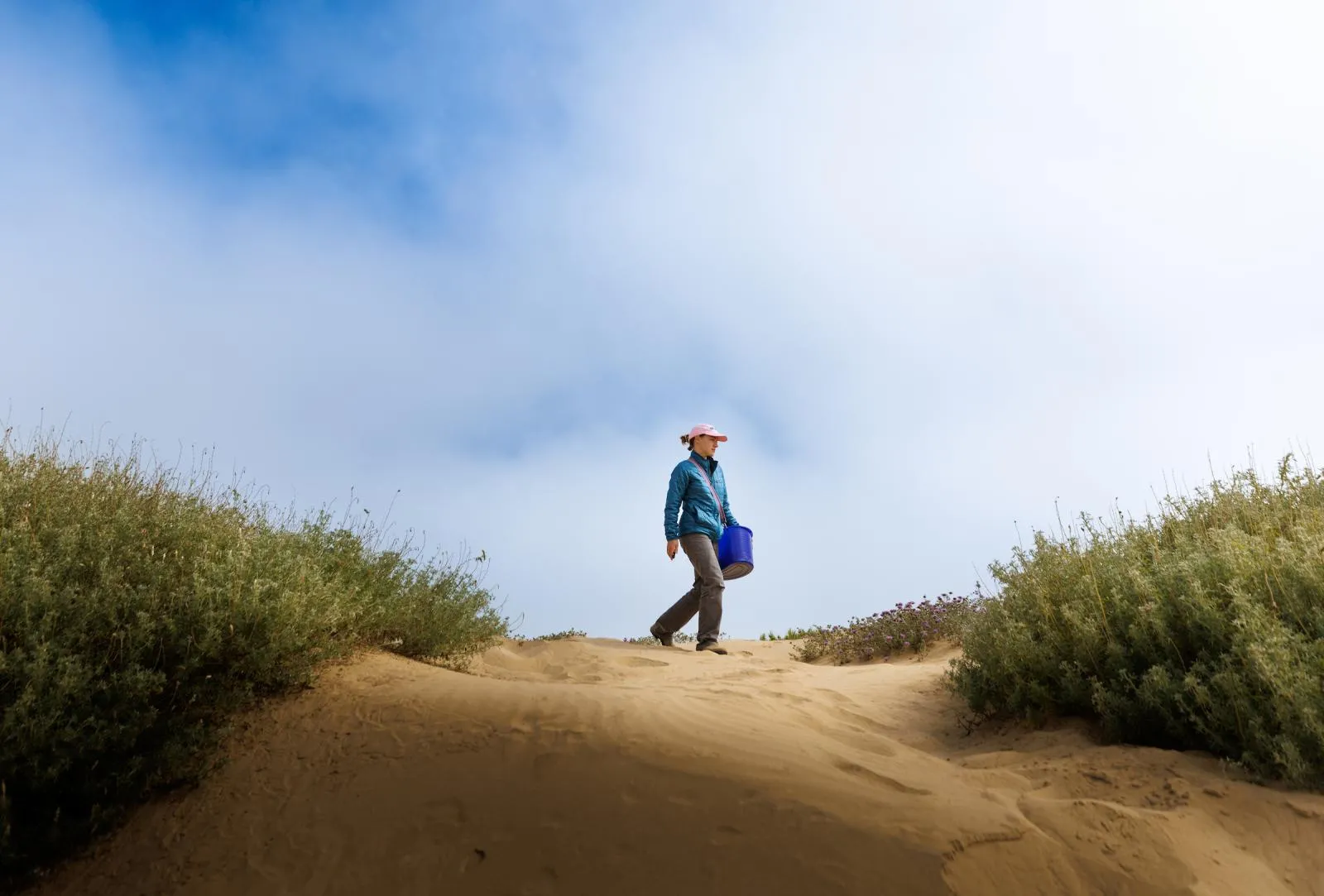 A student walks through the dunes as she collects seeds from native plants as part of a partnership between the university and State Parks on a project that entails growing up to 200,000 native dune plants from seedlings each year to help restore native plant habitats to the local dunes area. The native seeds are gathered and delivered to the university, where they are grown in campus greenhouses until they are ready to be transplanted in the dunes.