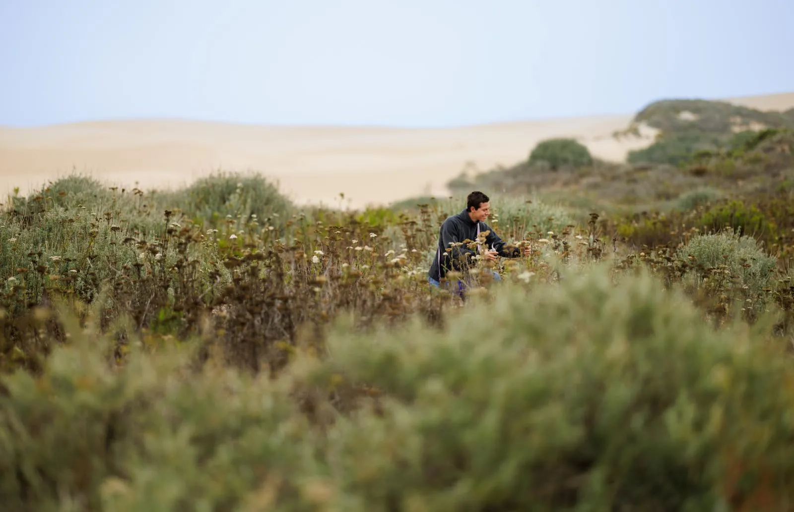 A student collects seeds from native plants as part of a partnership between the university and State Parks on a project that entails growing up to 200,000 native dune plants from seedlings each year to help restore native plant habitats to the local dunes area. The native seeds are gathered and delivered to the university, where they are grown in campus greenhouses until they are ready to be transplanted in the dunes.