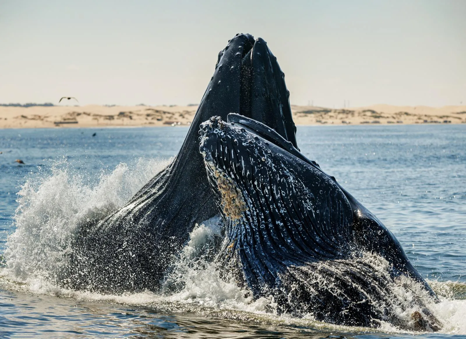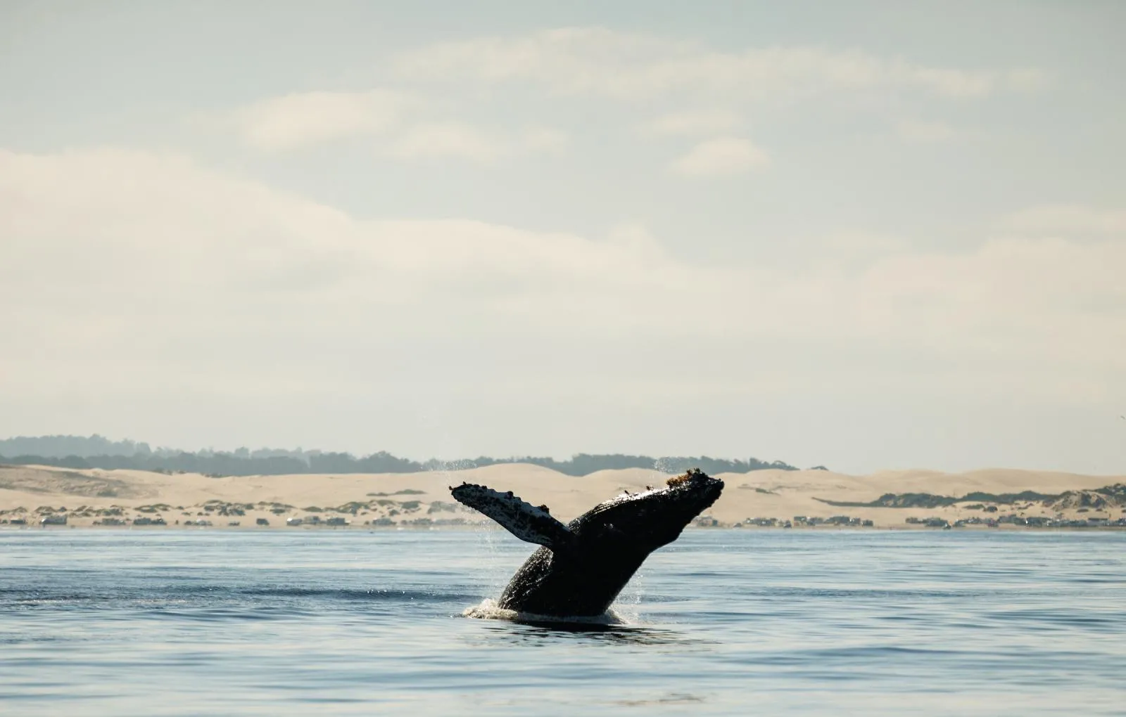 A whale is seen breaching in the waters off of the California Central Coast during a morning trip where students, working with a professor, deployed a custom-designed hydrophone device offshore. They are part of an interdisciplinary team working on a long-term research project whose aim is to expand current marine mammal monitoring along this stretch of coast.