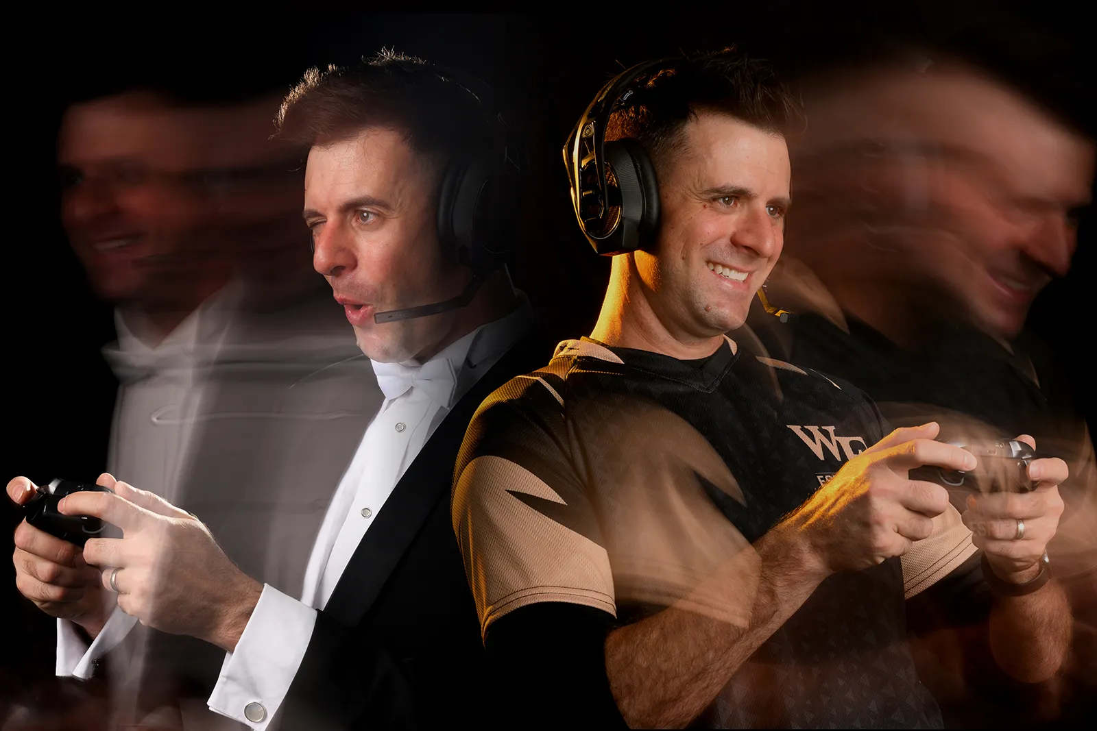 Music Prof. Hardwick poses for portraits for a story about a class he teaches on ludomusicology.