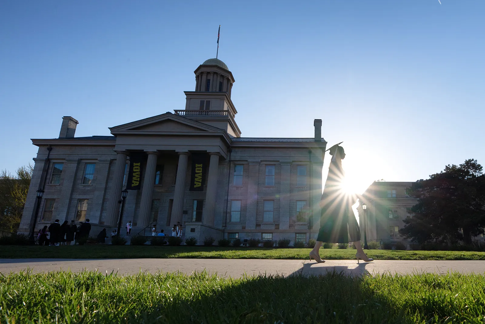 A graduating senior walks through a beam of sunlight on the Pentacrest