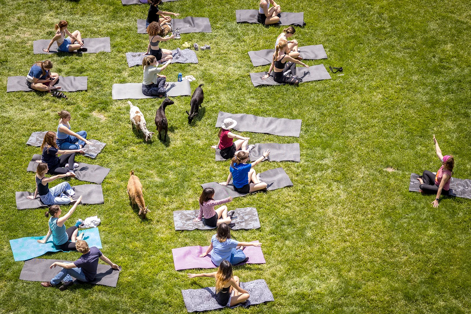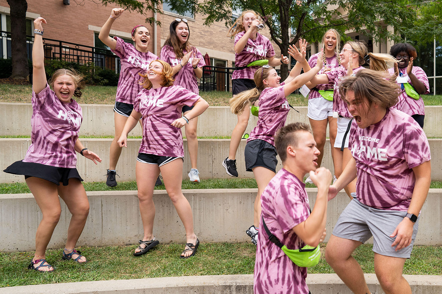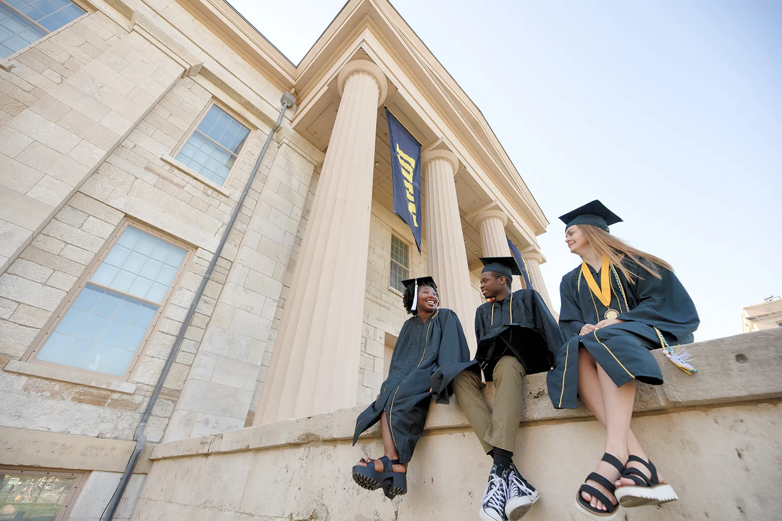 Graduating seniors sit and converse on the front of the Old Capitol steps