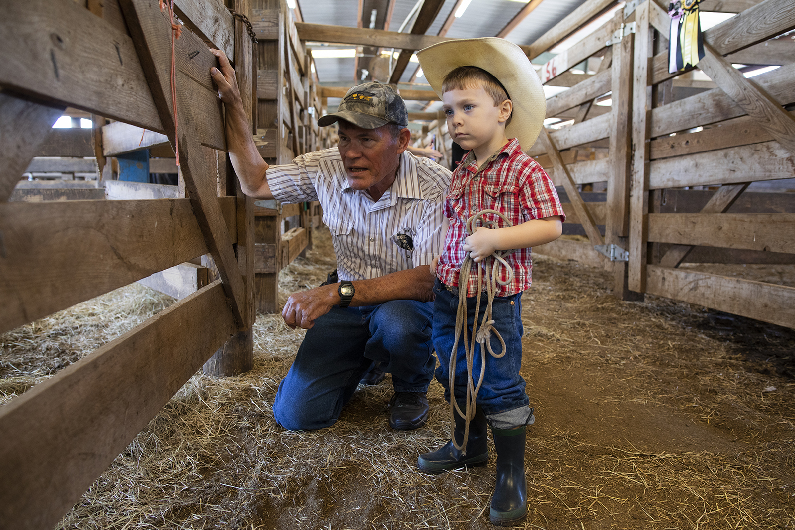 Ayden Hensley and his grandfather Ken Hensley peer into a stable to look at one of the numerous heifers up for sale at the 2022 4-H Sumter County Bred Heifer Auction.