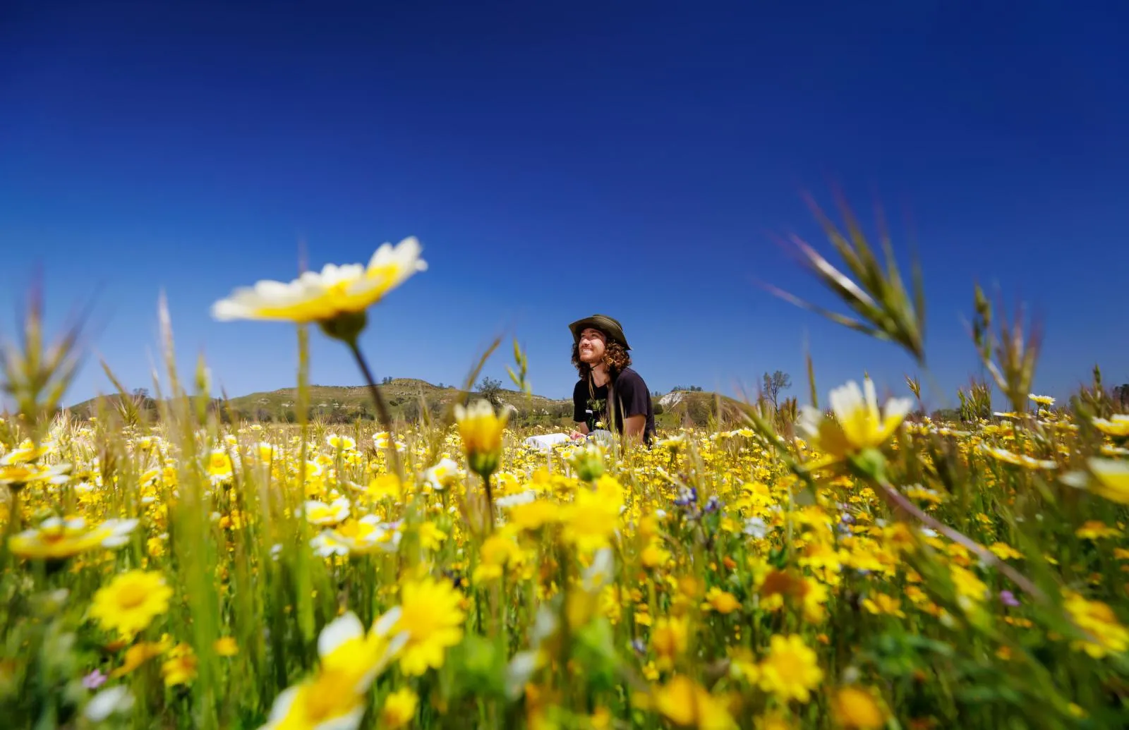 A student taking part in a field trip with the university's Field Botany - California Plant Diversity class sits in a field of wildflowers during a super bloom this spring.