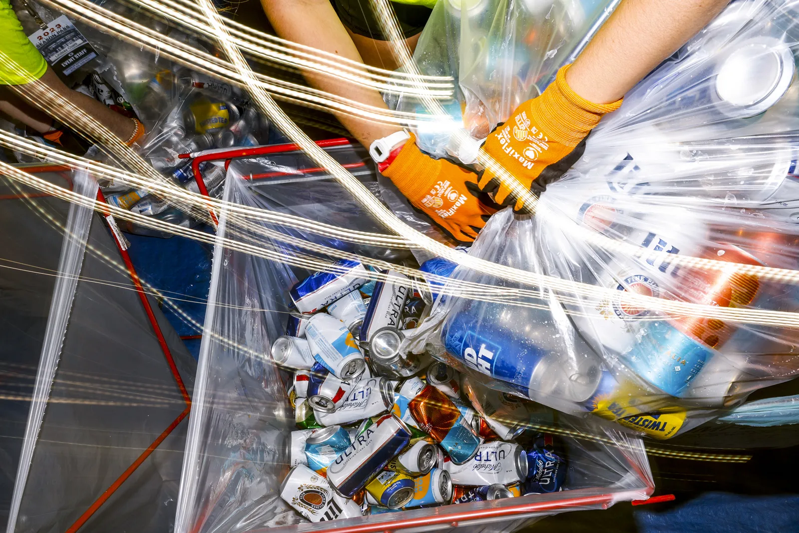 Volunteers sort cans for recycling during a zero waste initiative in honor of Earth Week during Georgia's first game of the baseball series against Arkansas.