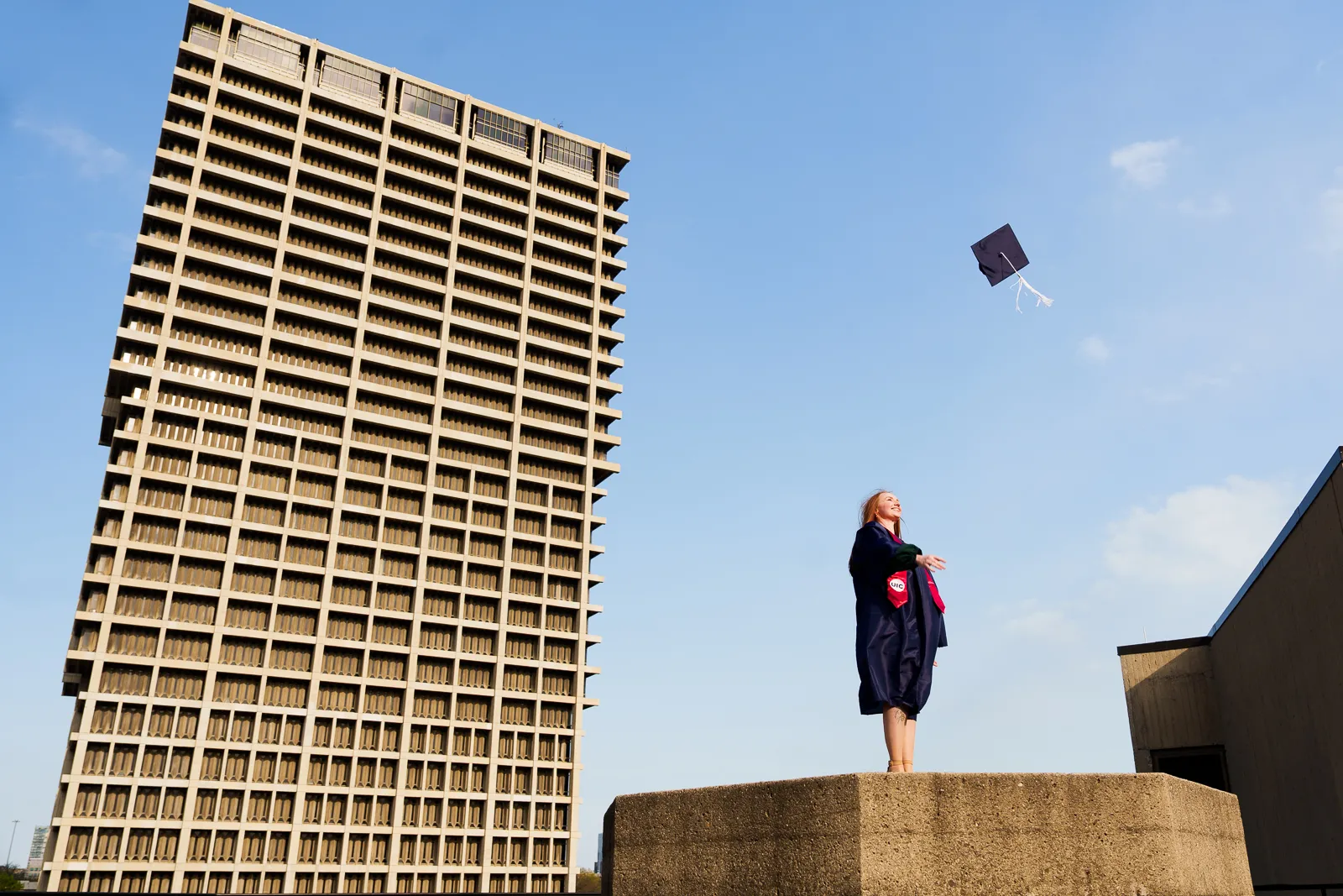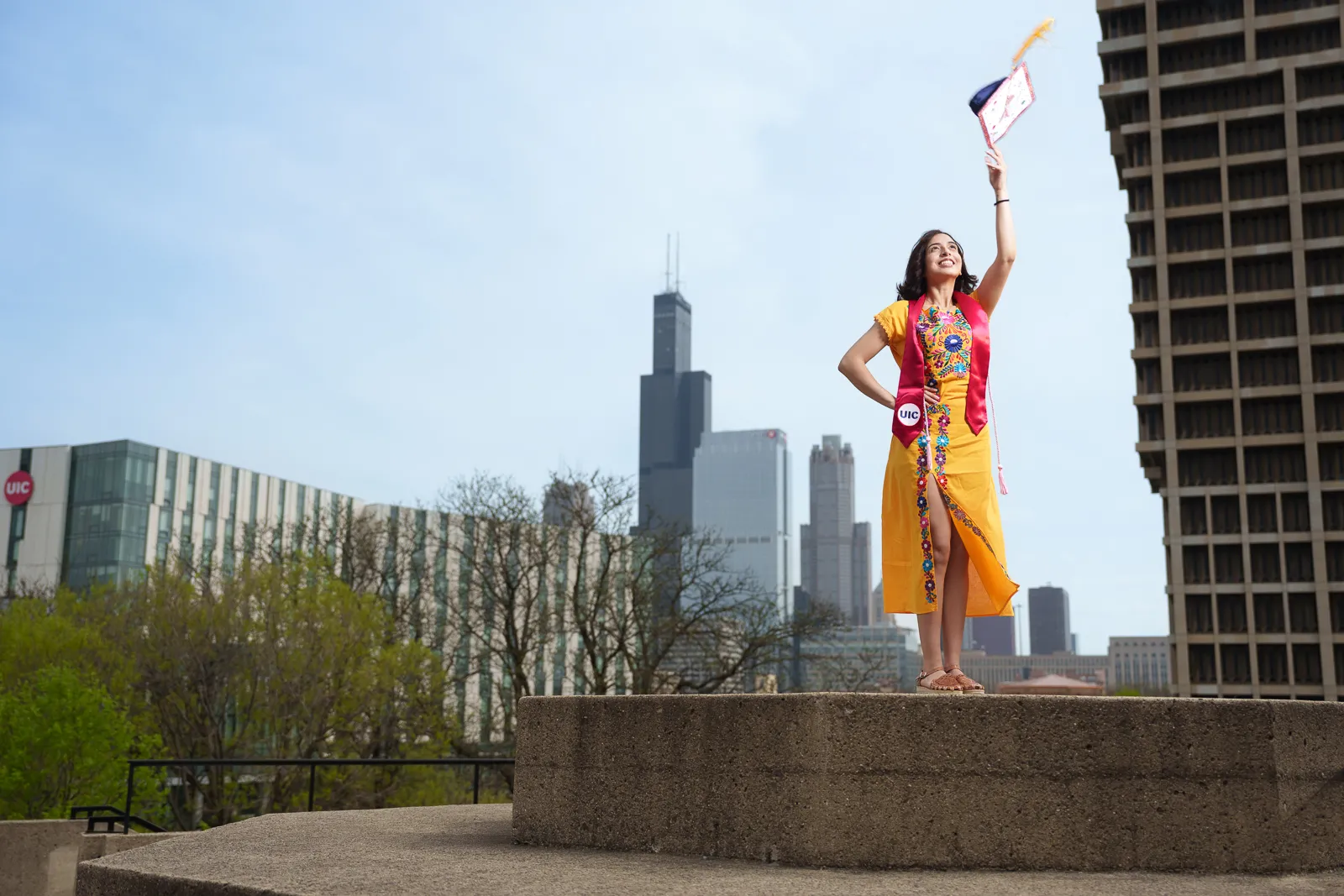 Architecture student Lisa McClay celebrates with Walter Netsch's brutalist structure University Hall.