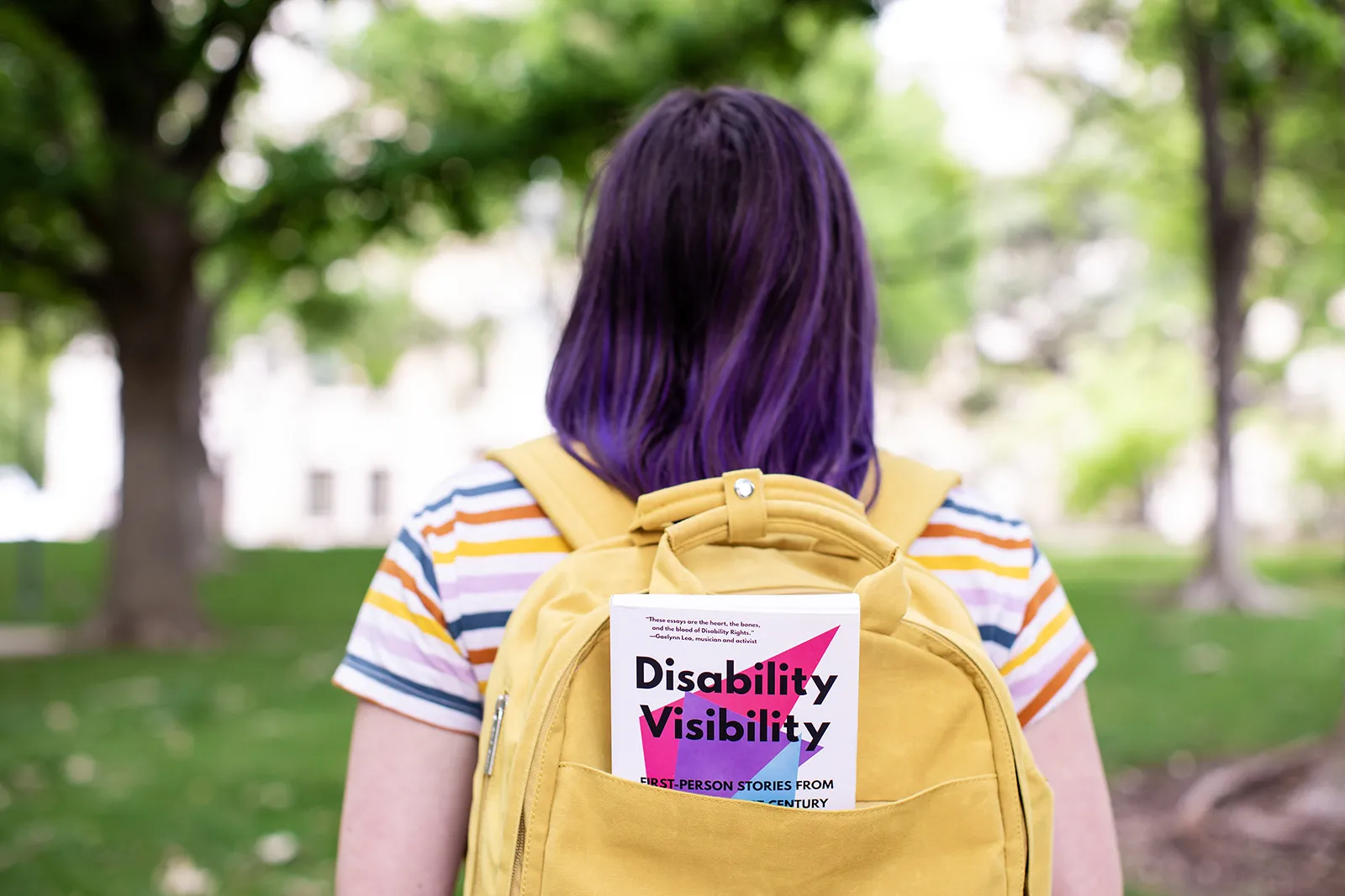 Each year, a book is selected as the common theme for incoming students to read their freshmen year and for programming to be made around it. This year's is Disability Visibility. Each year I have to photograph the book. After seeing the cover, I wanted to pair it with my colorful hair, backpack and shirt to make for a bright image.