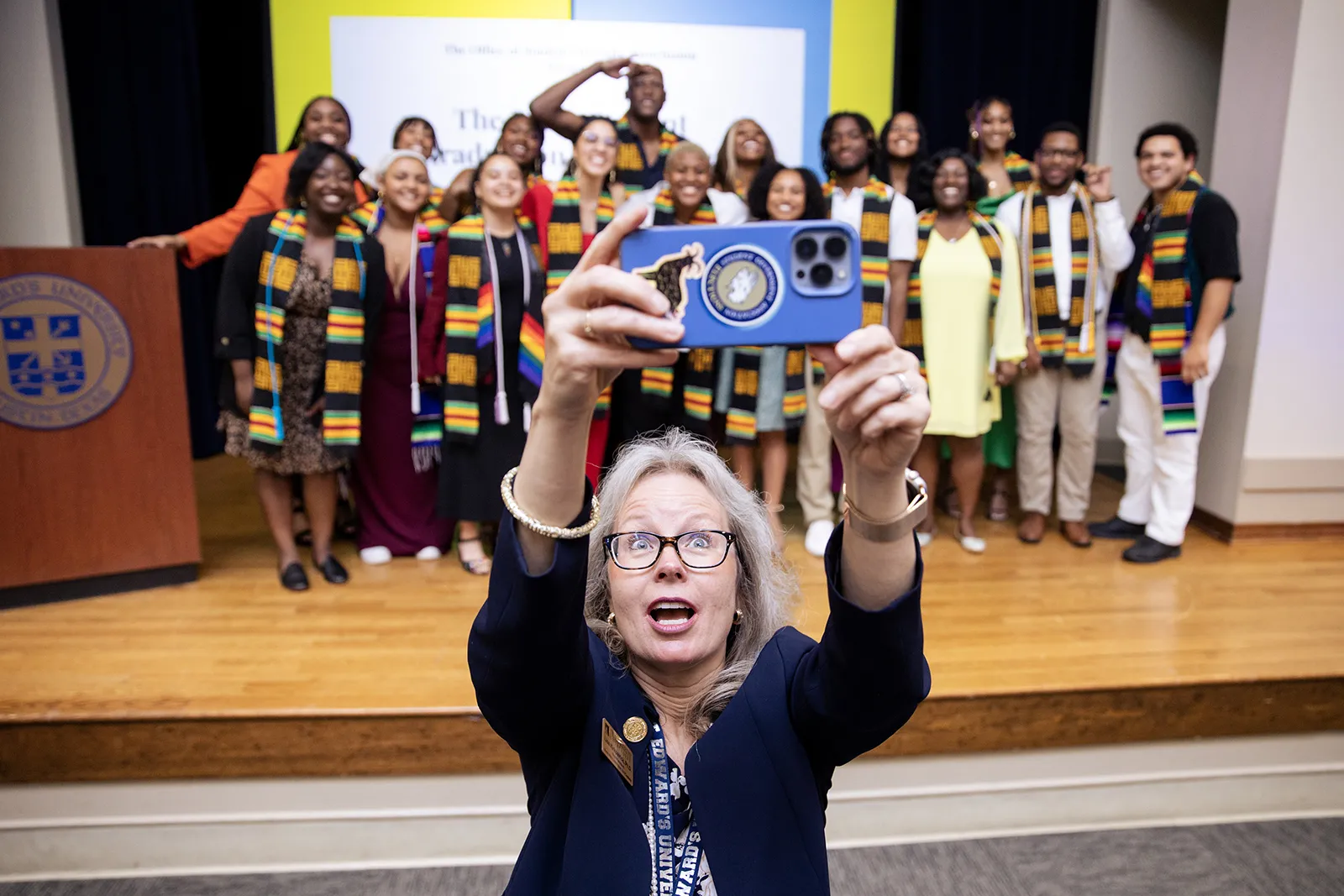 If there's one thing Dr. Kirkpatrick is going to do, it's take a selfie for her infamous instagram account. Here's her taking a selfie with all of the seniors at the Black Student Graduation Celebration.