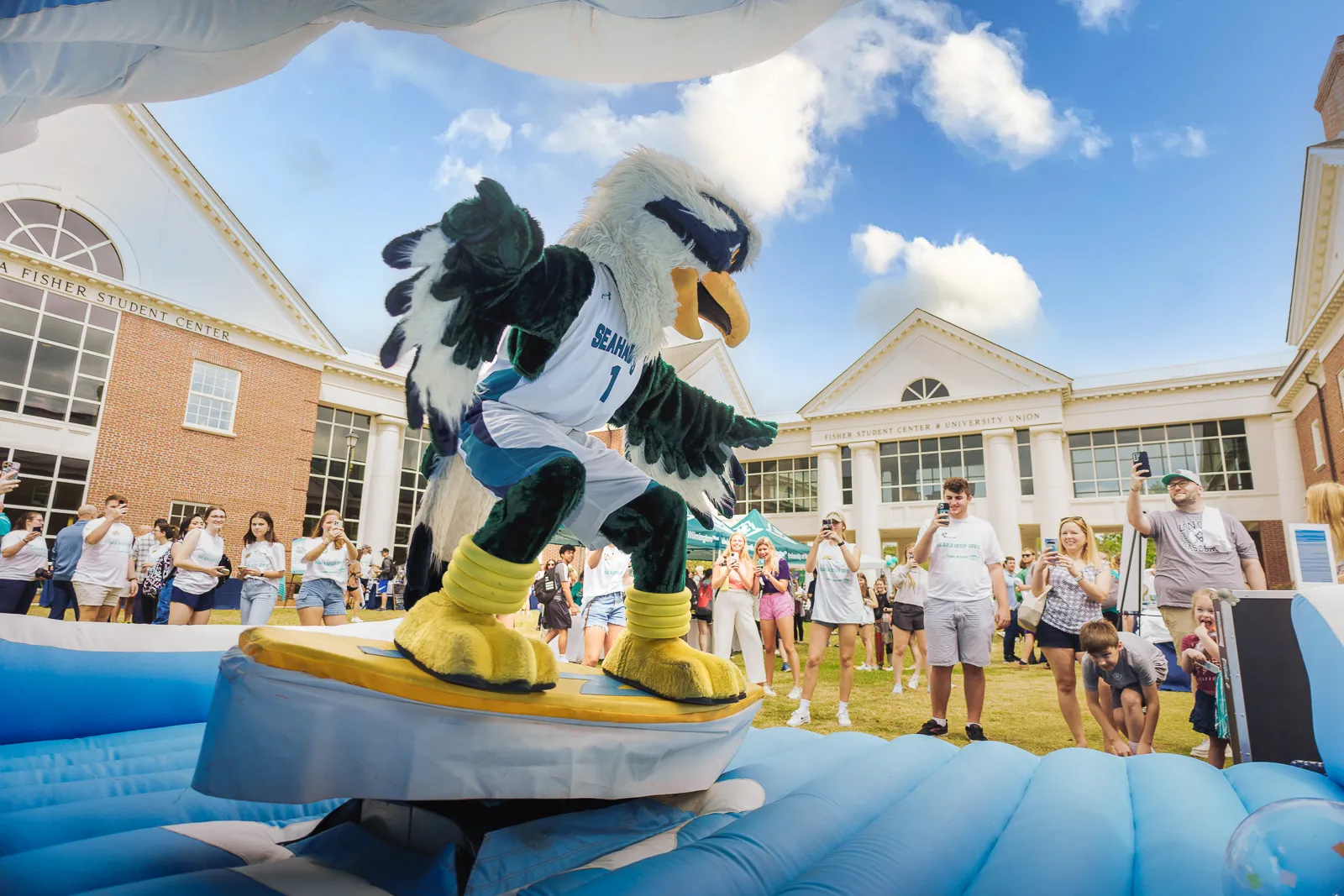 Sammy the Seahawk hangs 10 on the inflatable wave machine during the gift drive on campus.