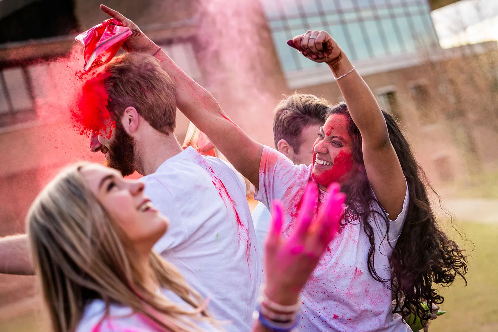 Bellarmine University student Divya Joseph, tosses red color on Gus Buck alongside fellow students who participate in a color throw celebrating the Holi Festival of Colors hosted by Campus Ministry in Louisville, Kentucky on March 8, 2023.