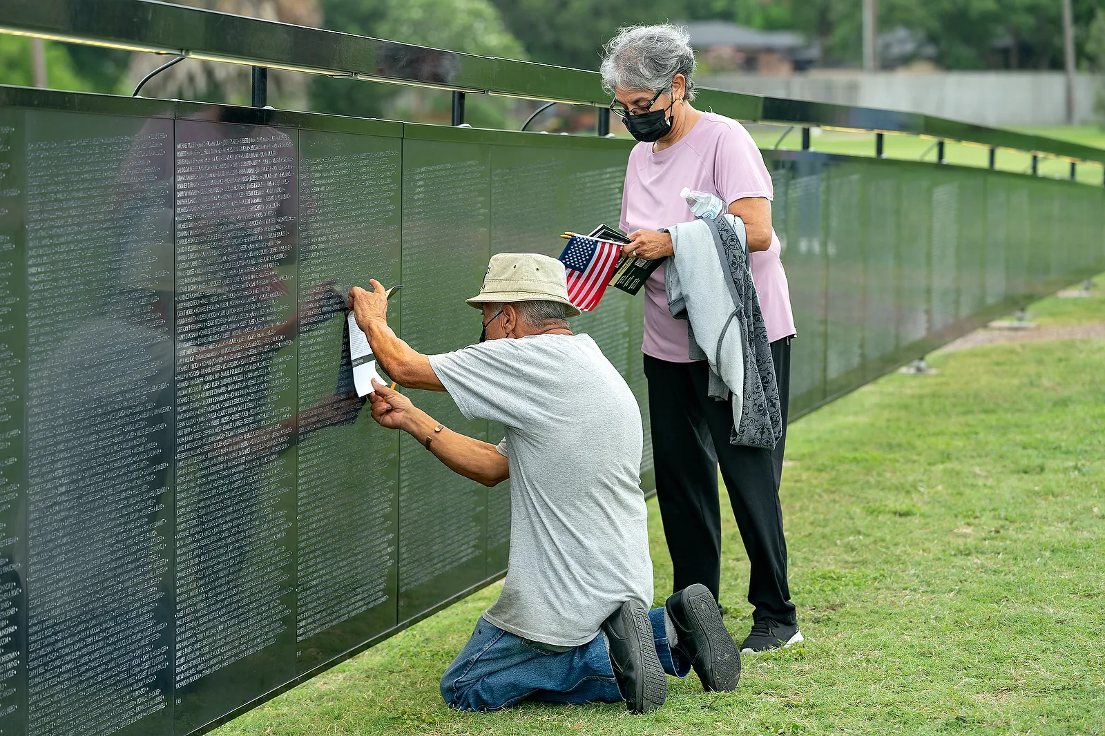 A guest does a name imprint of a veteran he knew at The Wall That Heals, a traveling Vietnam veterans memorial replica sponsored by the university and the city on Thursday, April 20, 2023.