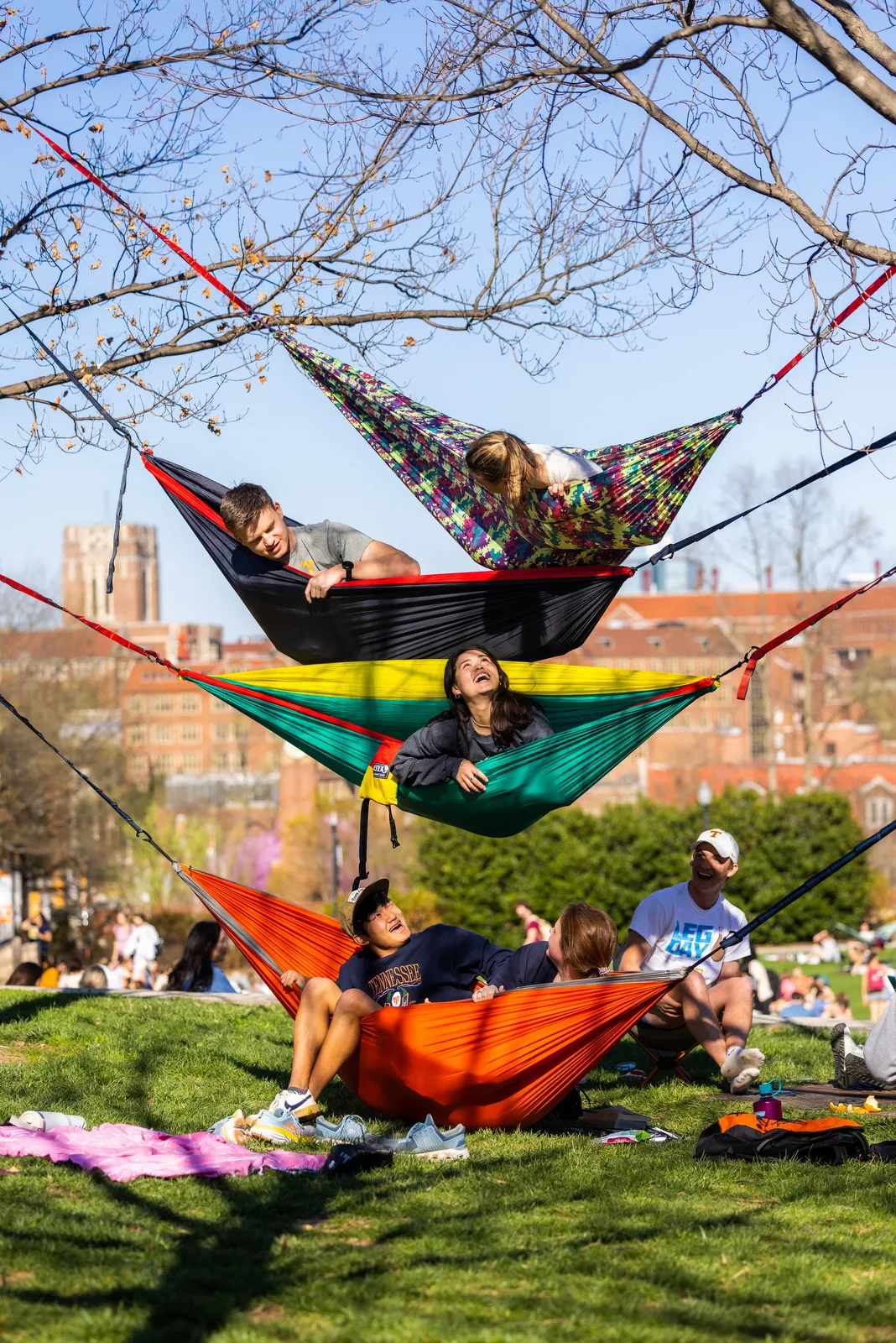 Students enjoy a warm afternoon in a stack of hammocks.