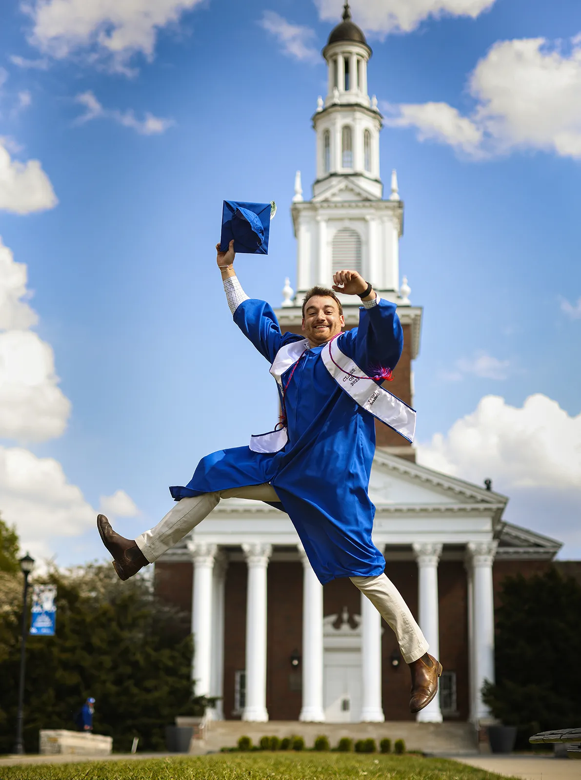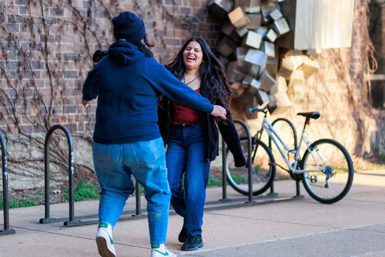 A behind the scenes photo, from March 29, 2023, of students staging a greeting for an Amazon film production, The College Tour.