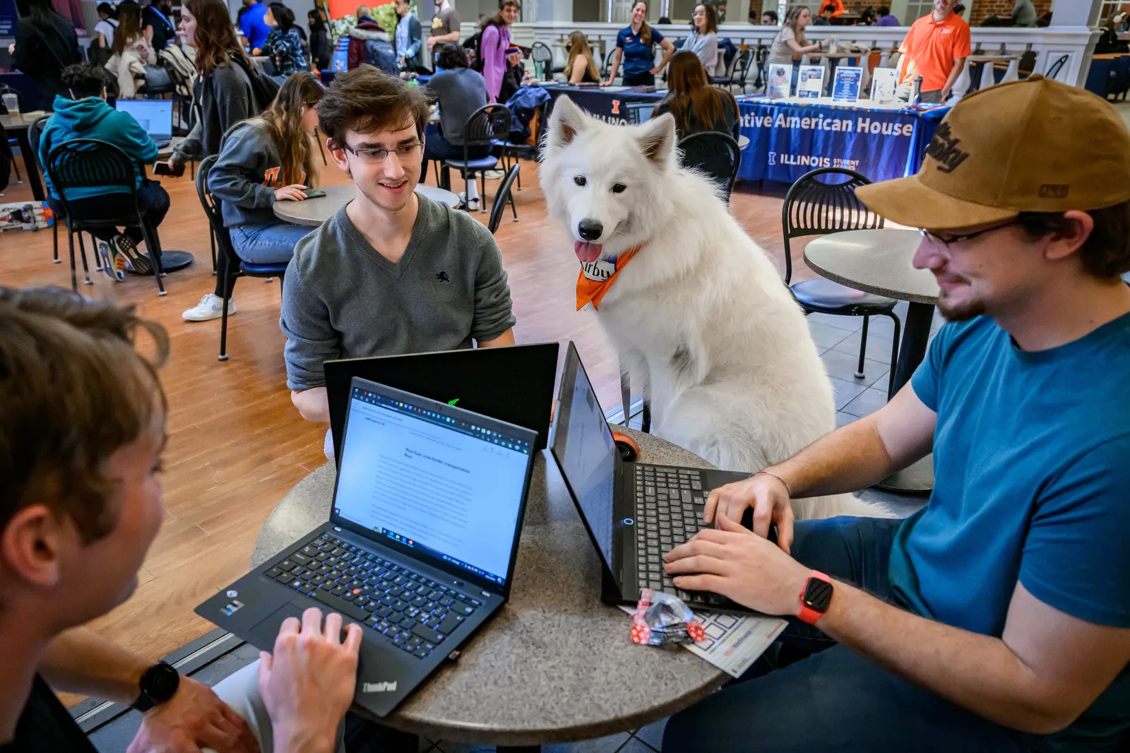 This study group gets some extra brain power from Kirby, a campus police department therapy who loves to hop up on chairs to watch people work. This study group was working when Kirby decided to check out the action. Kirby was in the building that day for a “Wellness Week” event.