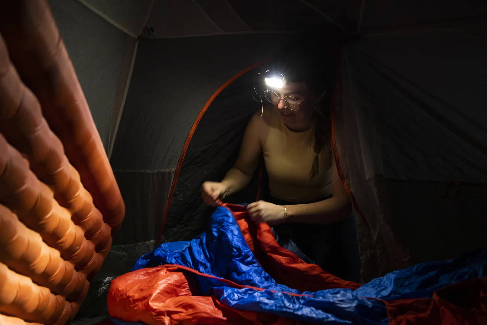 Emma Montgomery lays out her sleeping bag after finishing the fourth day of a bikepacking trip for the Texas Tech University Adventure Media class at the Organ Mountains Desert Peaks National Monument in Doña Ana County, New Mexico.
