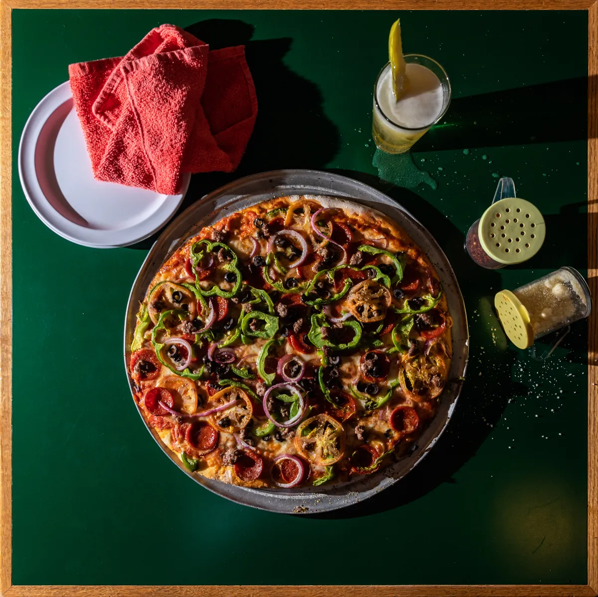 Mizzou Magazine is running a feature on the 50th anniversary of Shakespeare's Pizza. It's a staple to the people of Columbia, MO and Mizzou student life and culture. Hard to imagine this area without Shakespeare's. This photo was taken for one half of a spread with text in the lower left corner. Yes, that's a beer with a pickle in it, also a staple of Shakespeare's.