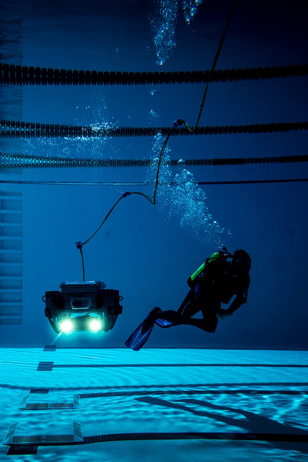 The underwater robotics design team tests their device in the university pool and practices tasks for competition.
