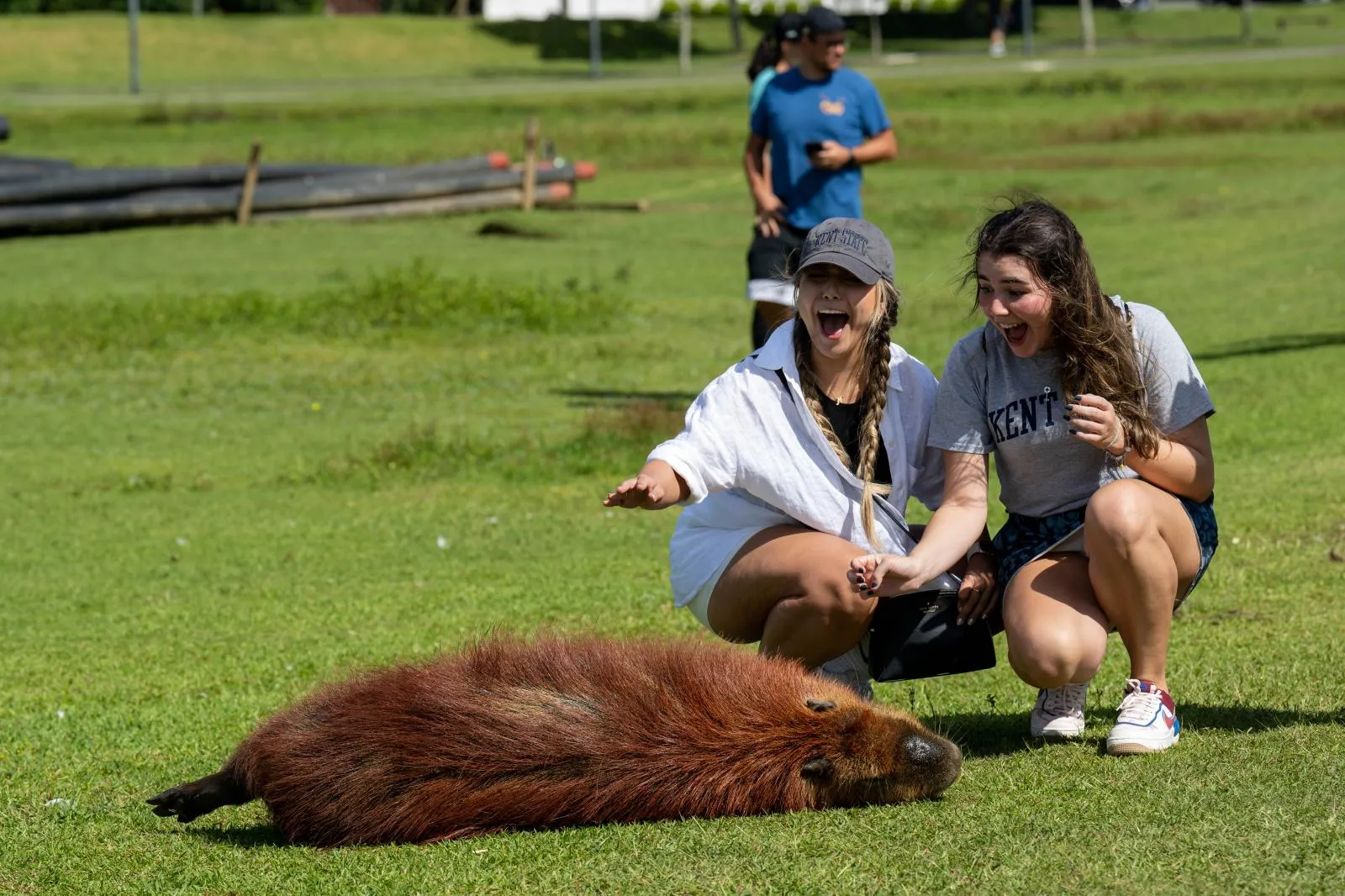 Students in the American Academy in Curitiba, Brazil pet one of the wild capybaras that roam a city park in the southern Brazil city.