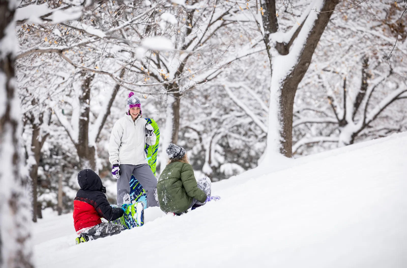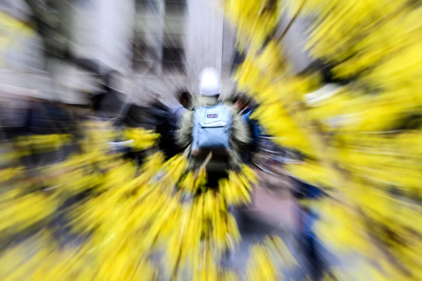 A student walk though campus during class beak framed by hamamelis virginiana, commonly known as witch-hazel.