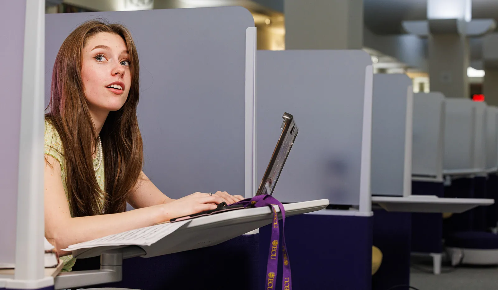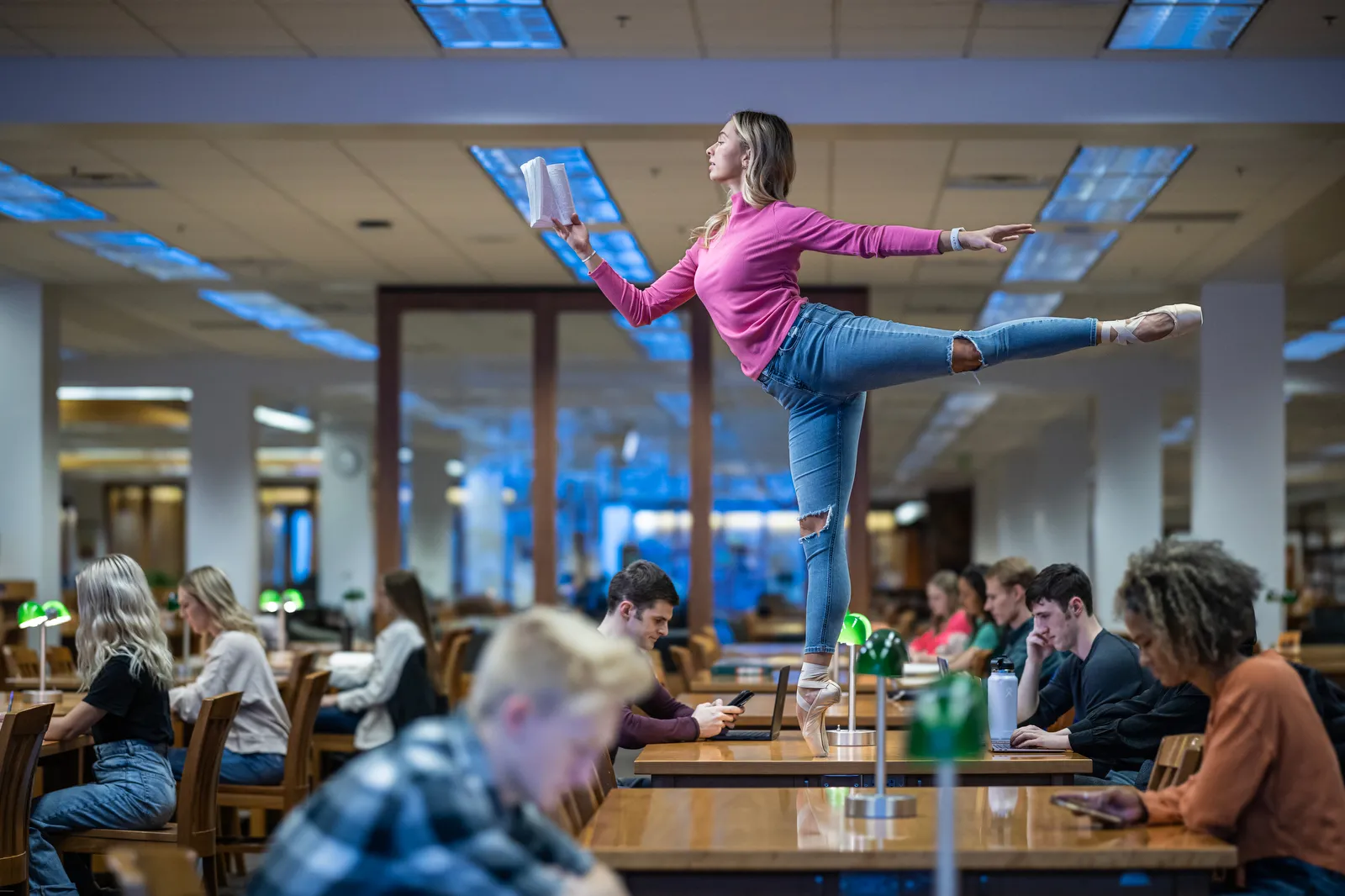 Ballet dancer in library among studying students.